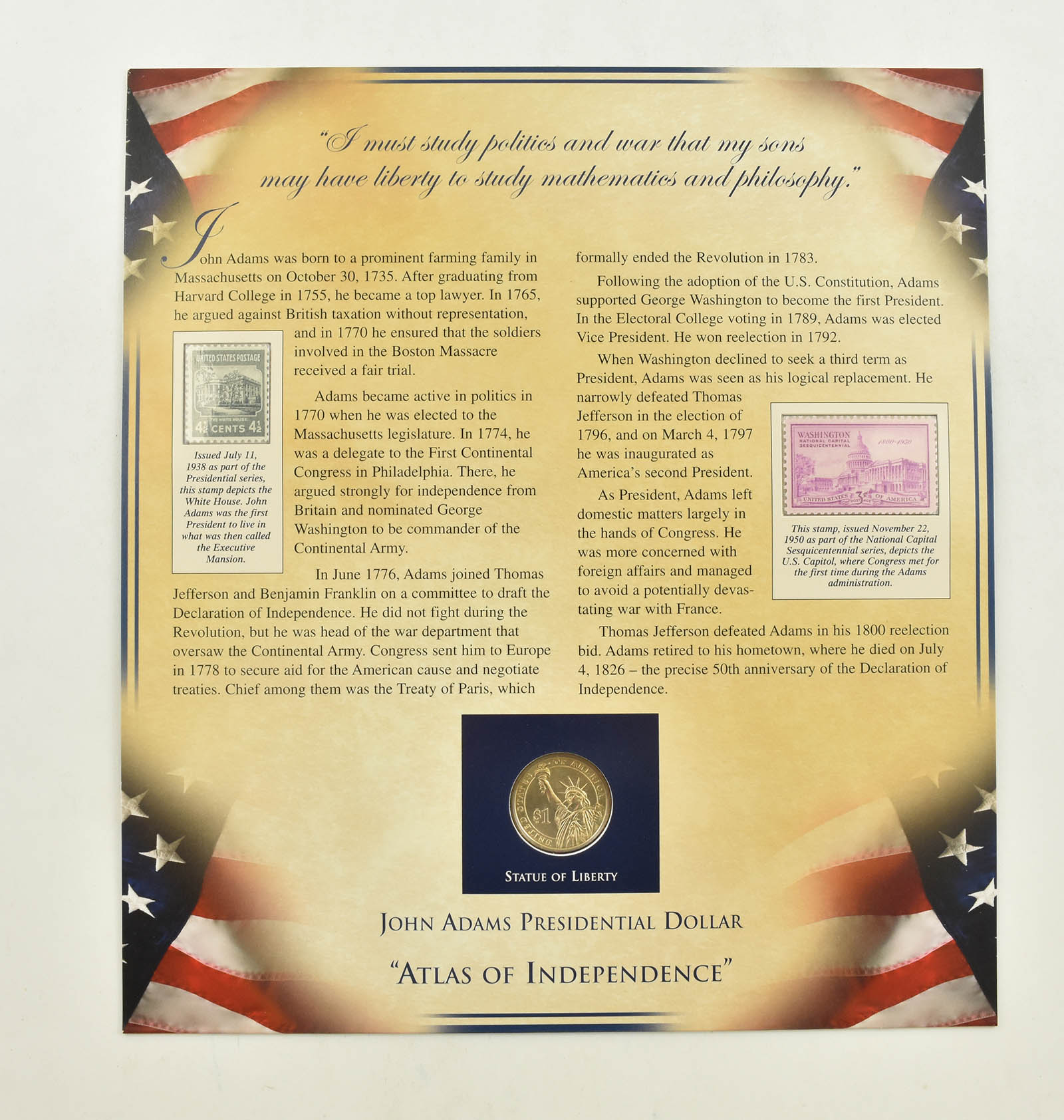 US Stamp & Presidential Dollar Beautifully Displayed Coin Set Story Board