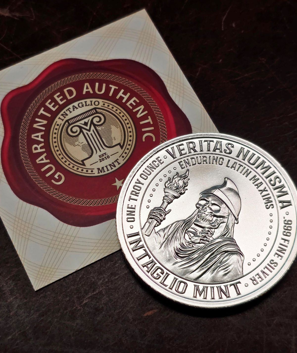 The reverse carries the series’ signature hallmark — a robed skeletal philosopher raising a torch beneath the banner “Enduring Latin Maxims”, framed by the Veritas Numisma title.