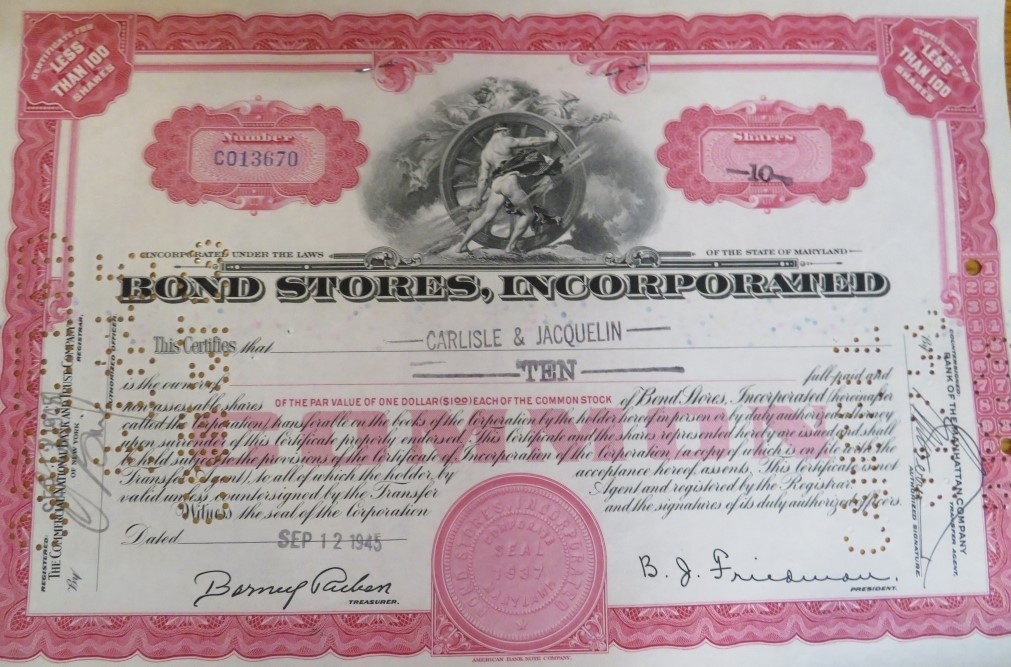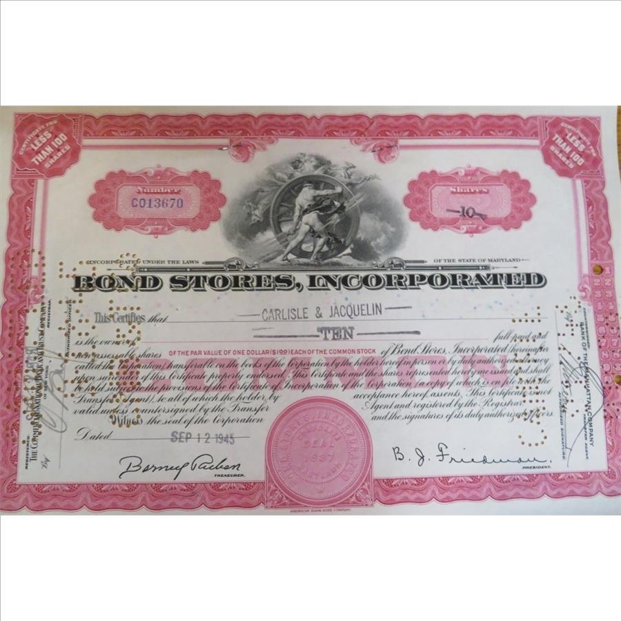 Vintage Bond Stores Inc. Collectible Stock Certificate