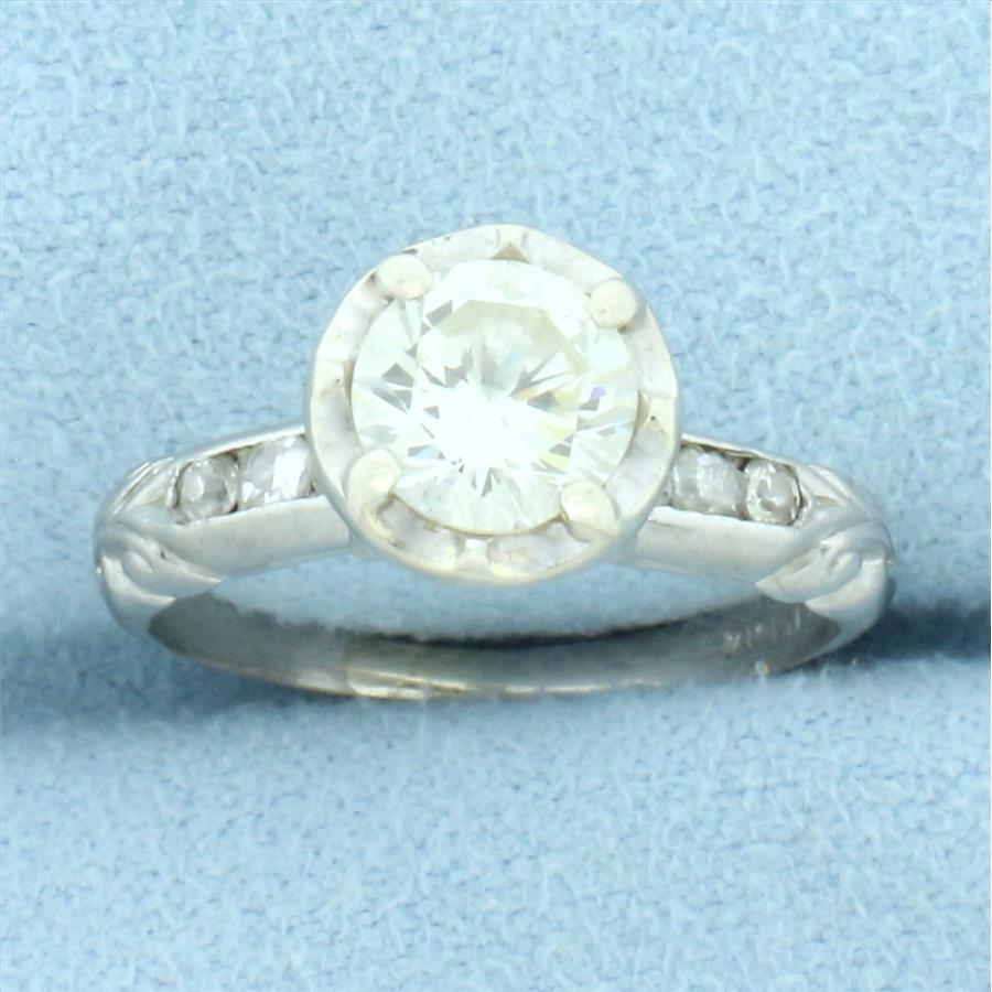 In Platinum. Contains one high quality natural .9ct round brilliant diamond VS clarity/J color. Reflective setting makes it look like a much larger center diamond. Also contains six high quality accent diamonds, .1ct TW, of similar high quality. Size 5 1/2. 3.9g.