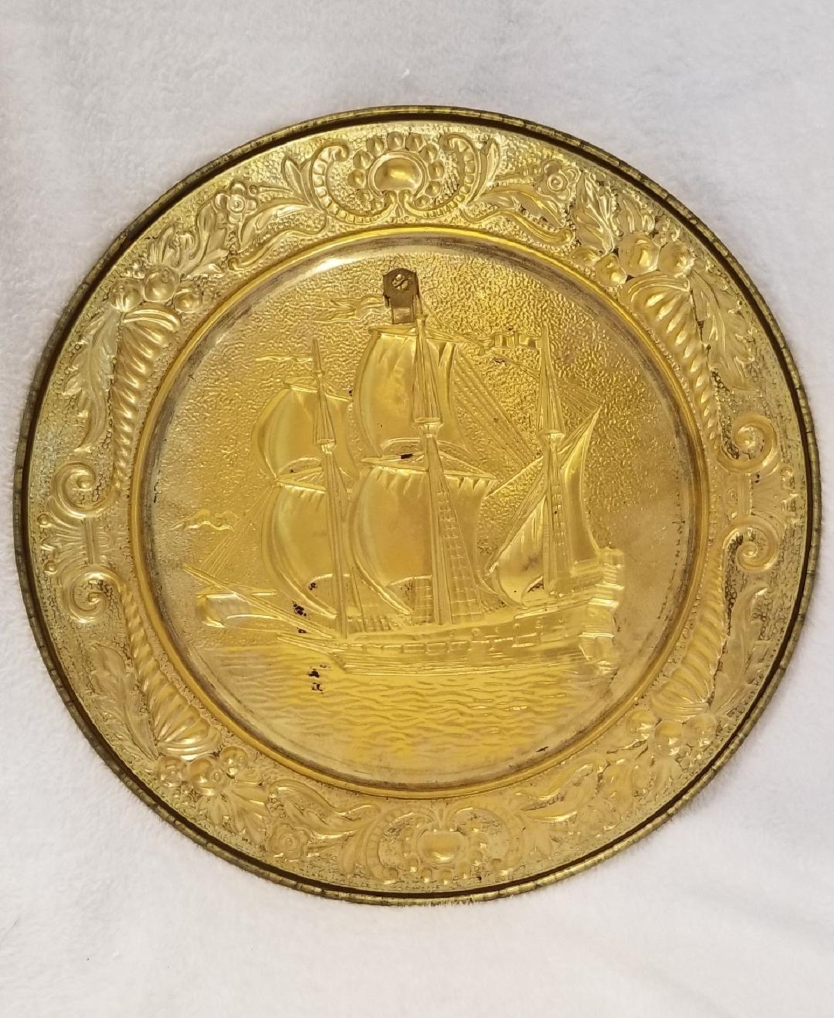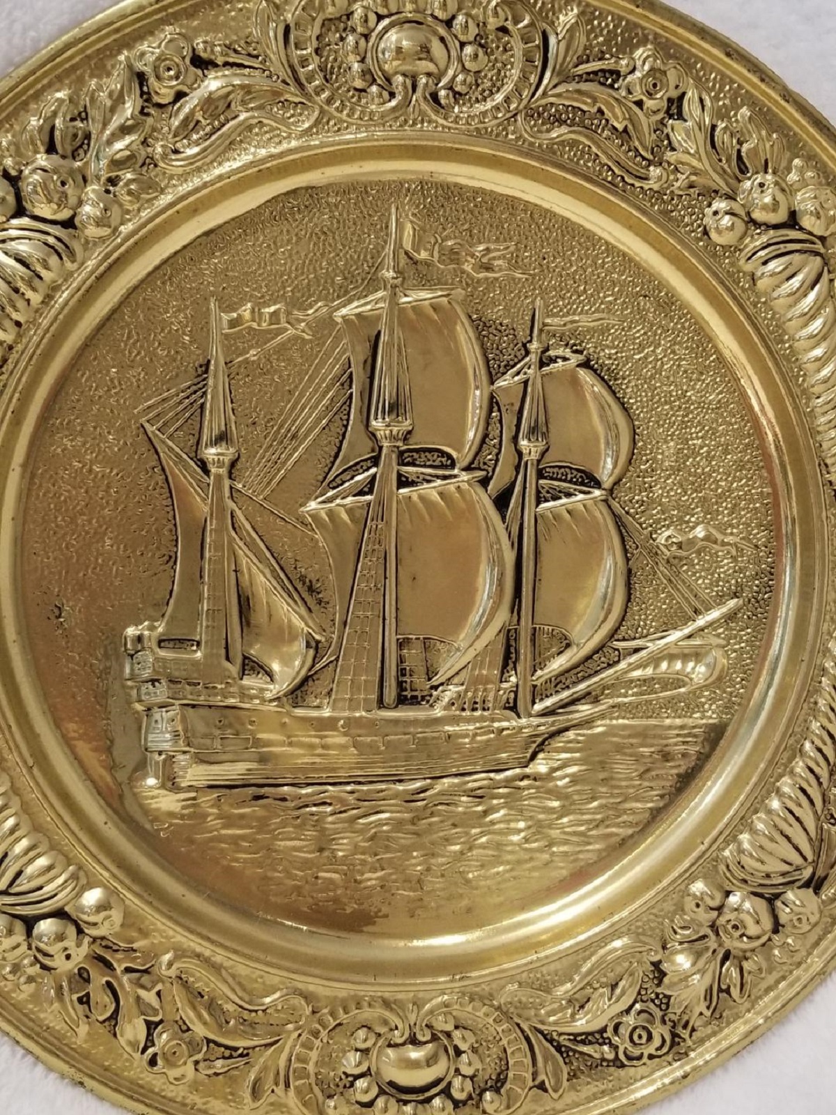 A vintage roundn old embossed brass wall plaque featuring an old sailing ship in the repouse art style.