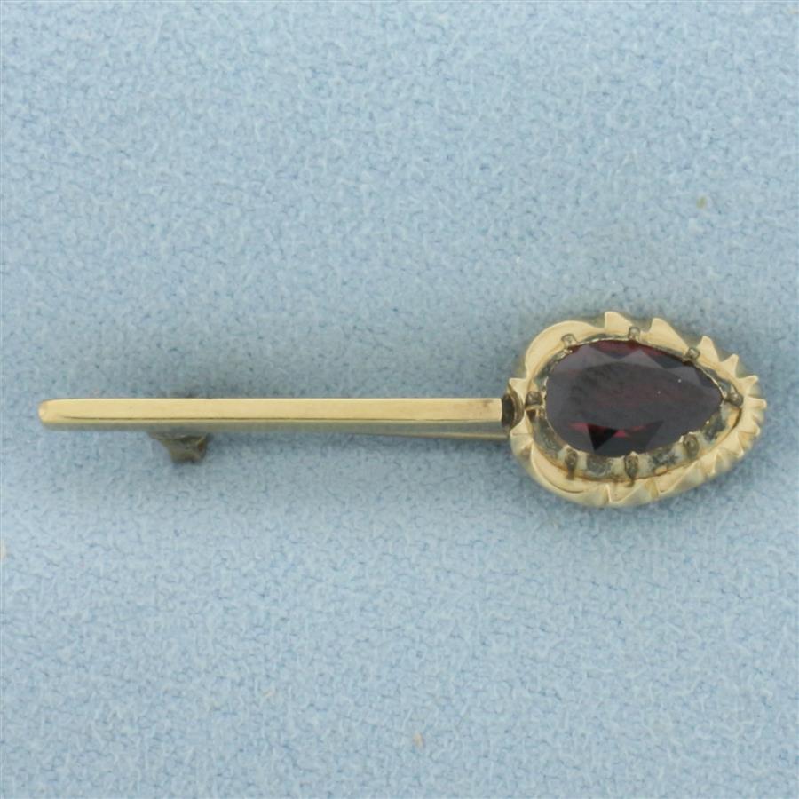 In 14k yellow gold. 1.25 inches long by 5/16 inches wide. Contains one high quality natural 1ct pear cut garnet gemstone with deep color and excellent clarity. 2.1g.