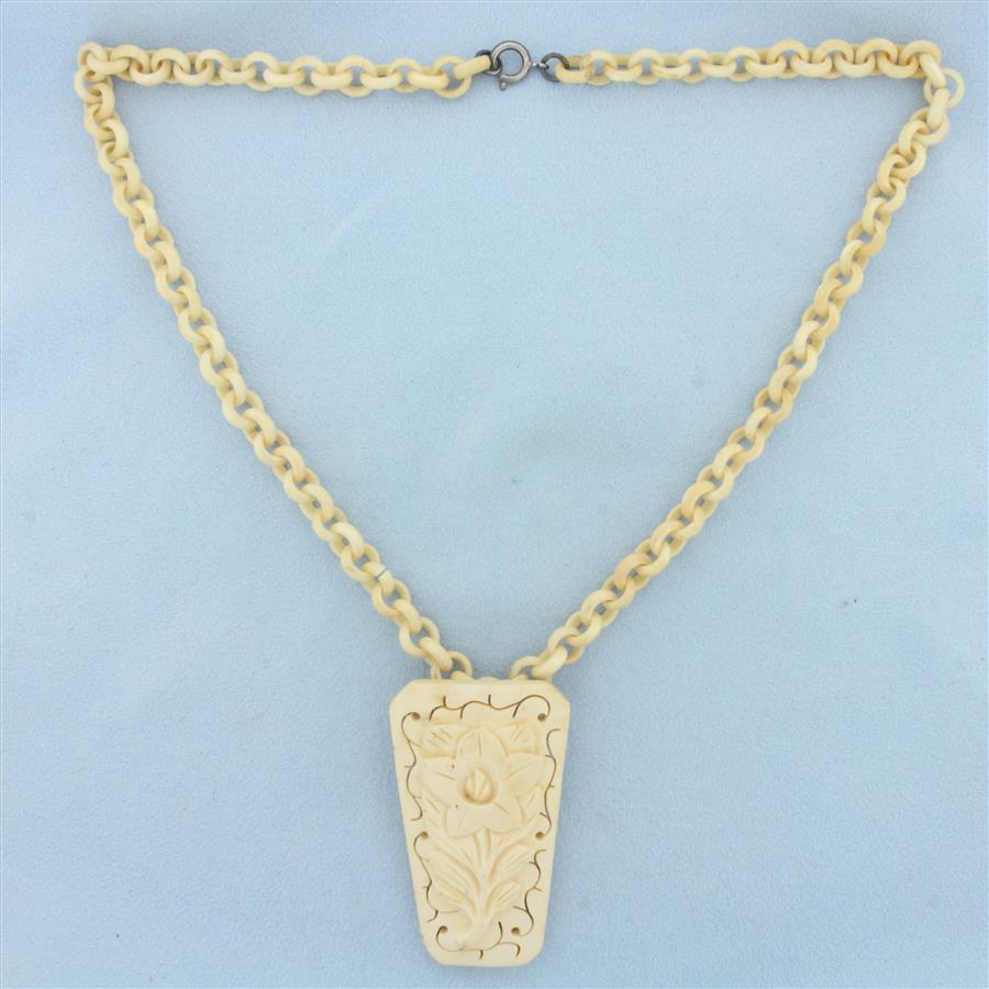 Vintage Hand Carved Bone Necklace With Sterling Silver Clasp