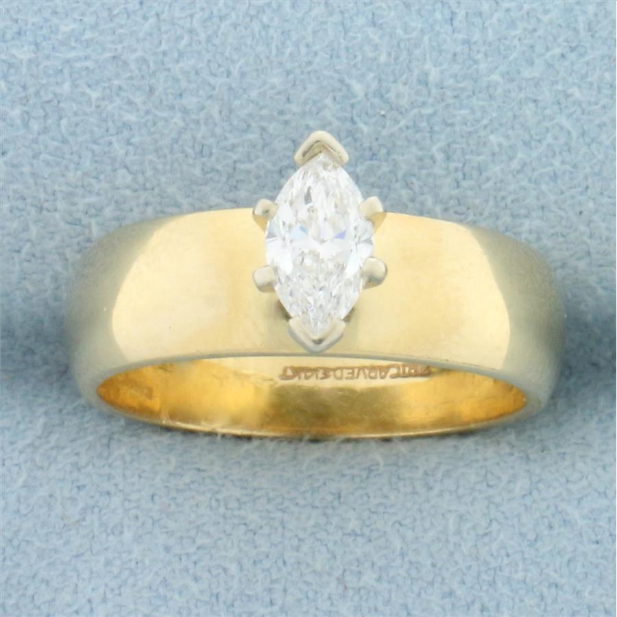 In 14k yellow gold. Contains one high quality 1/2ct marquise diamond, SI1 clarity/F color, completely eye clean and great cut for lots of sparkle. Size 7. 6.3g.