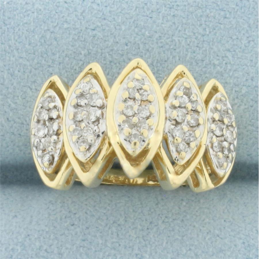 In 14k yellow gold. Contains forty high quality diamonds, 1/4ct TW, SI clarity/H color. Pave set into marquise shaped design. Size: 4.25. 4.4g.