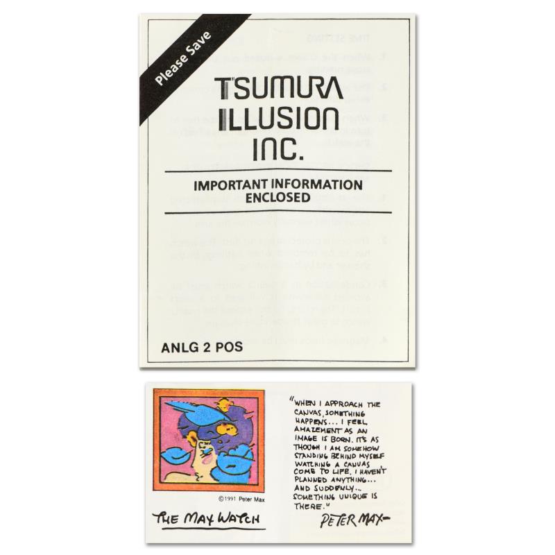 This is a vintage Peter Max "Profile" wrist watch created for the Japanese market in 1991. This watch comes in the original packaging and with paperwork. Due to the age of the watch the battery will need to be replaced. A replacement battery will be included in this auction complementary. Measures approx. 1.5" x 1.5" (watch face).