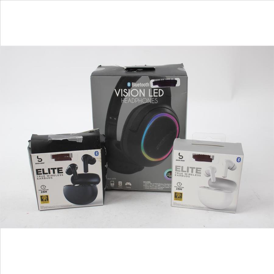 Vision LED Headphones, Hello Kitty Bluetooth Speaker, And Bass Jaxx Earbuds, 4 Pieces