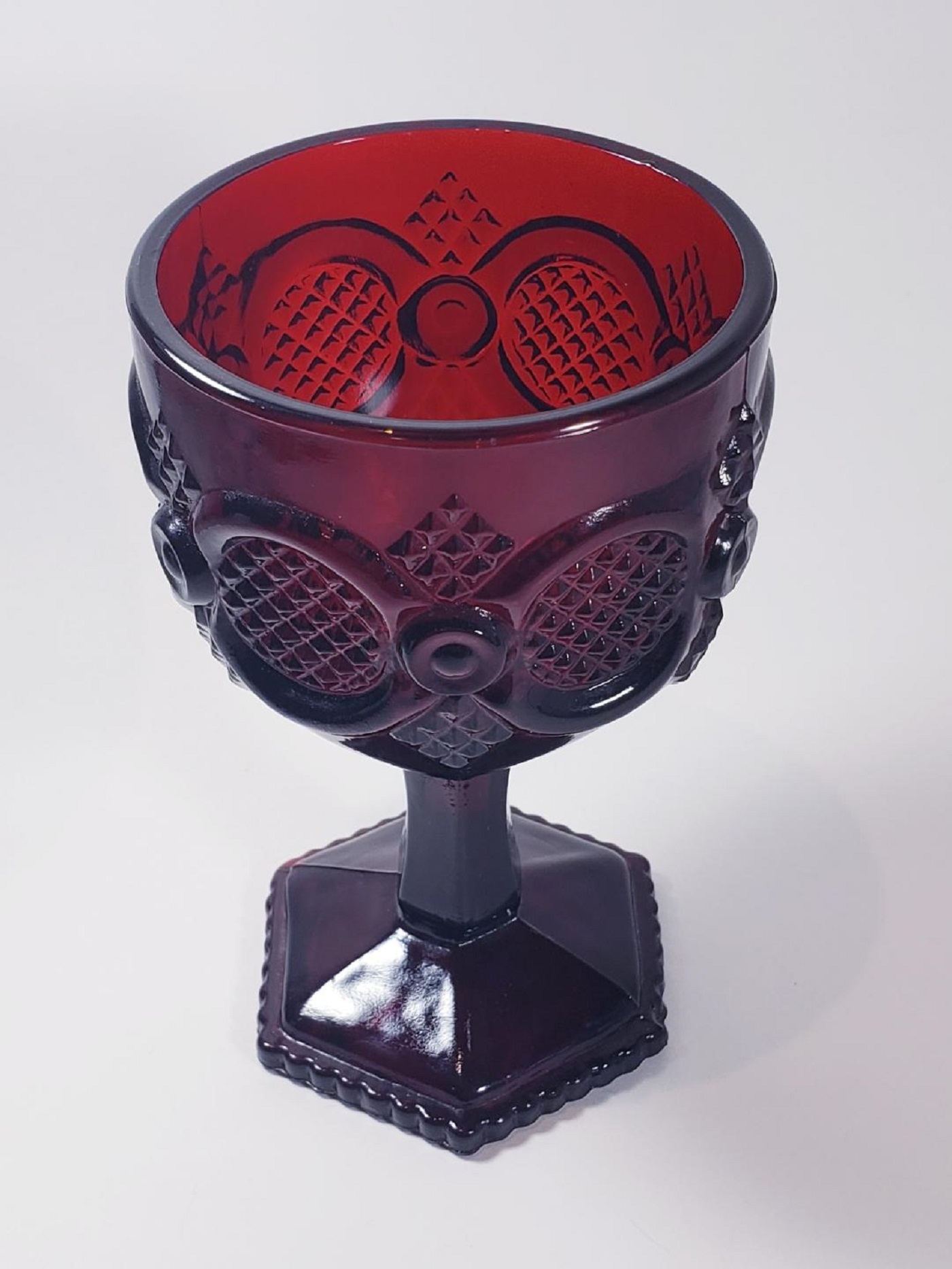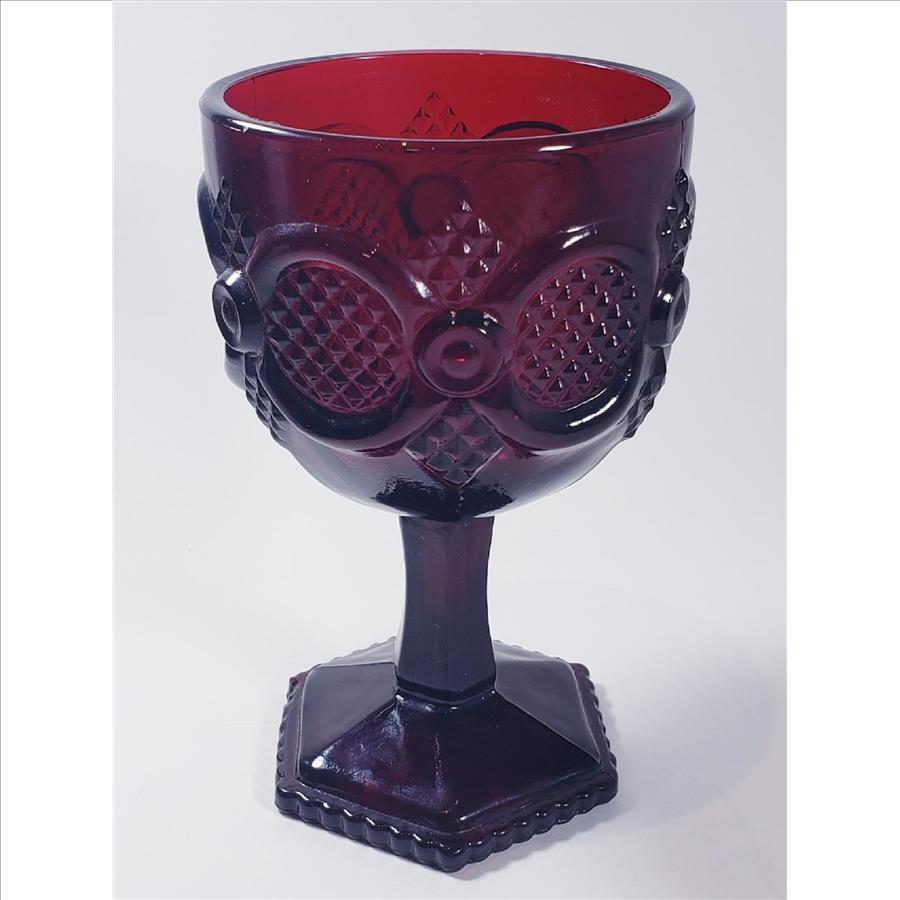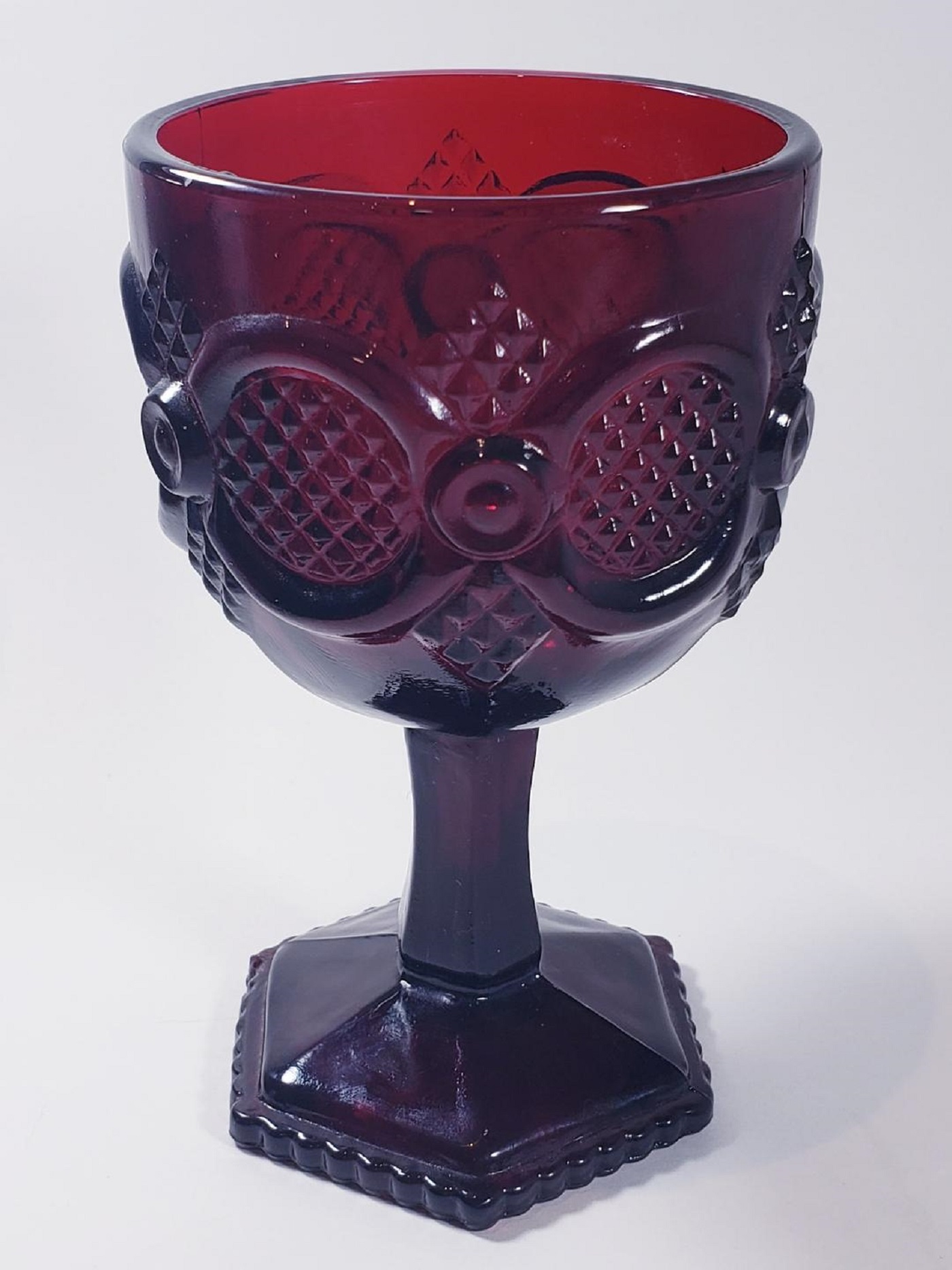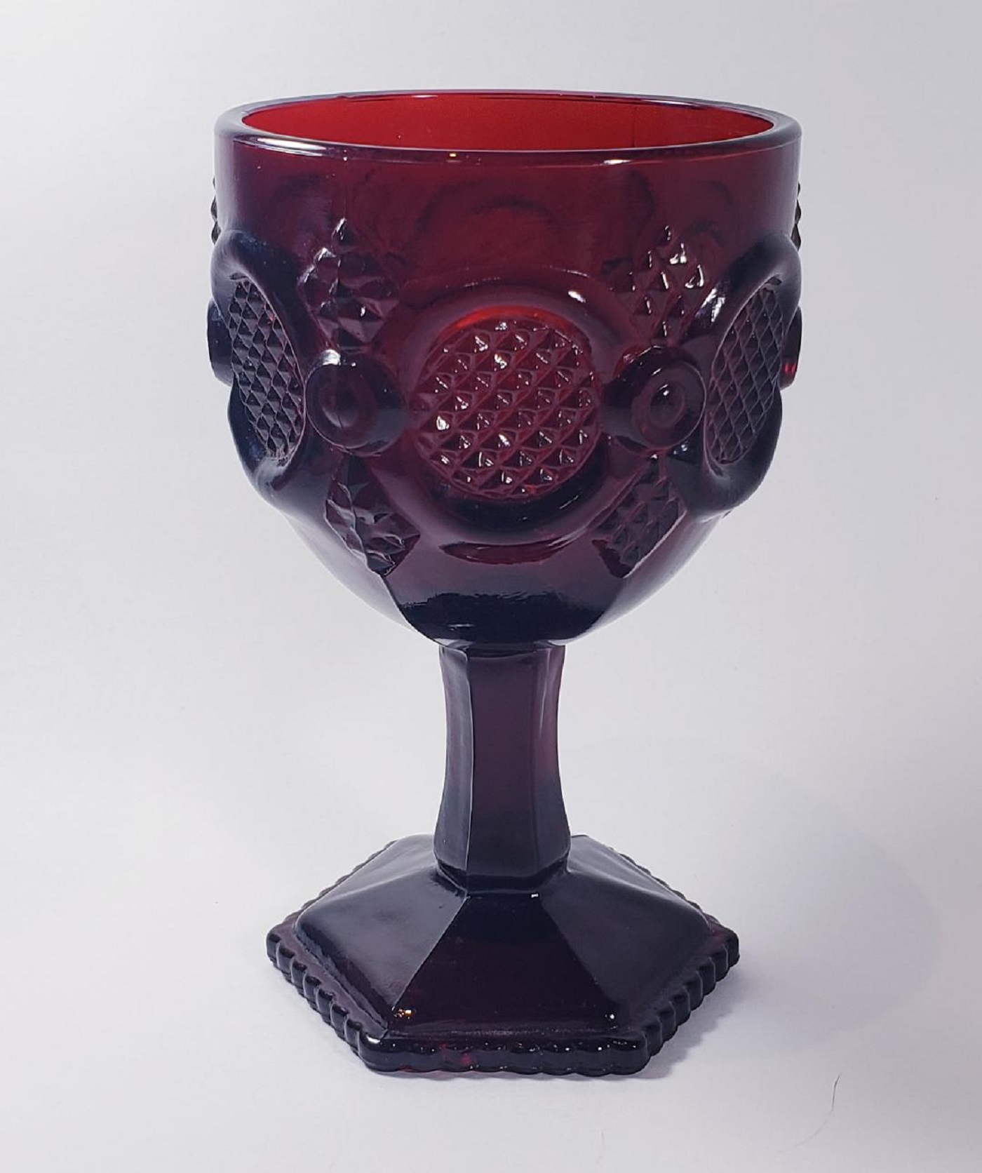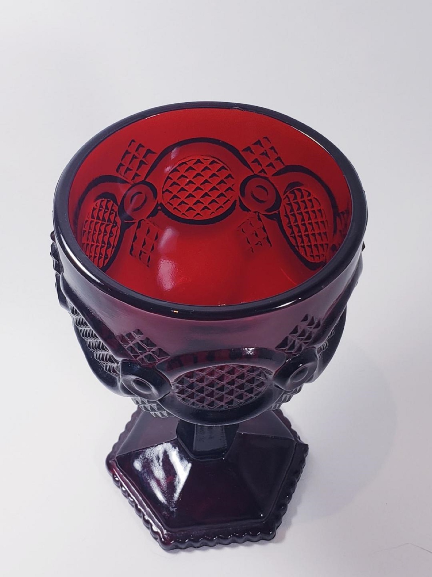 Beautiful Avon ruby from Cape Cod Collection, red large footed pedestal goblet or wine glass.