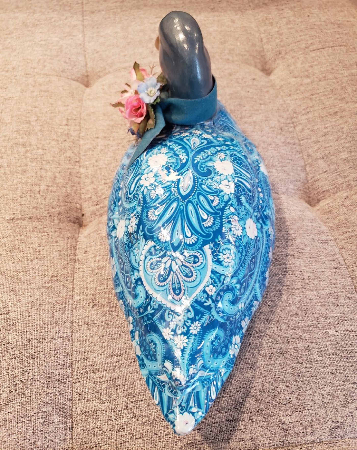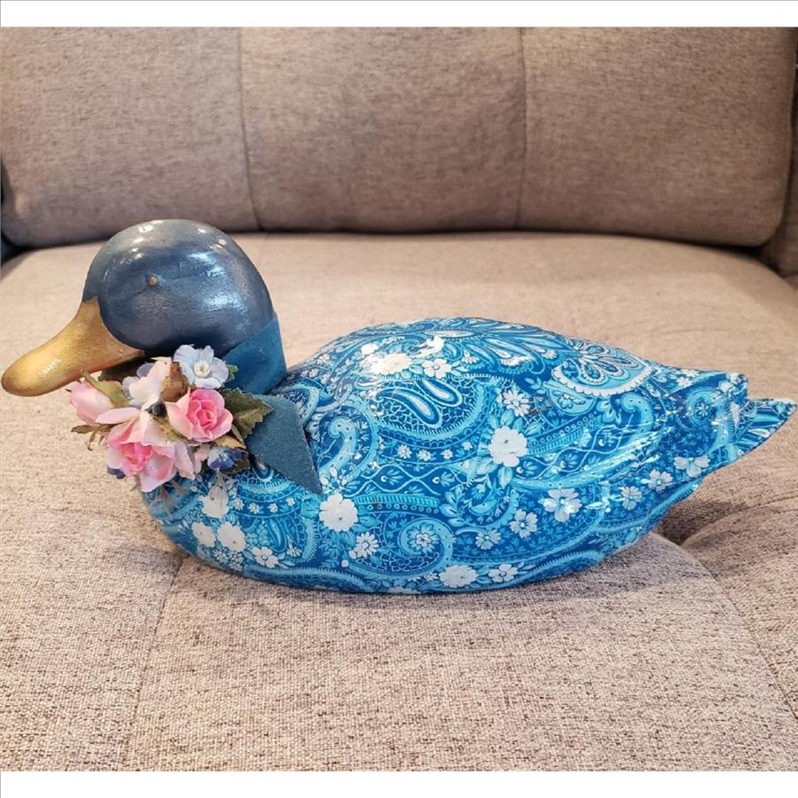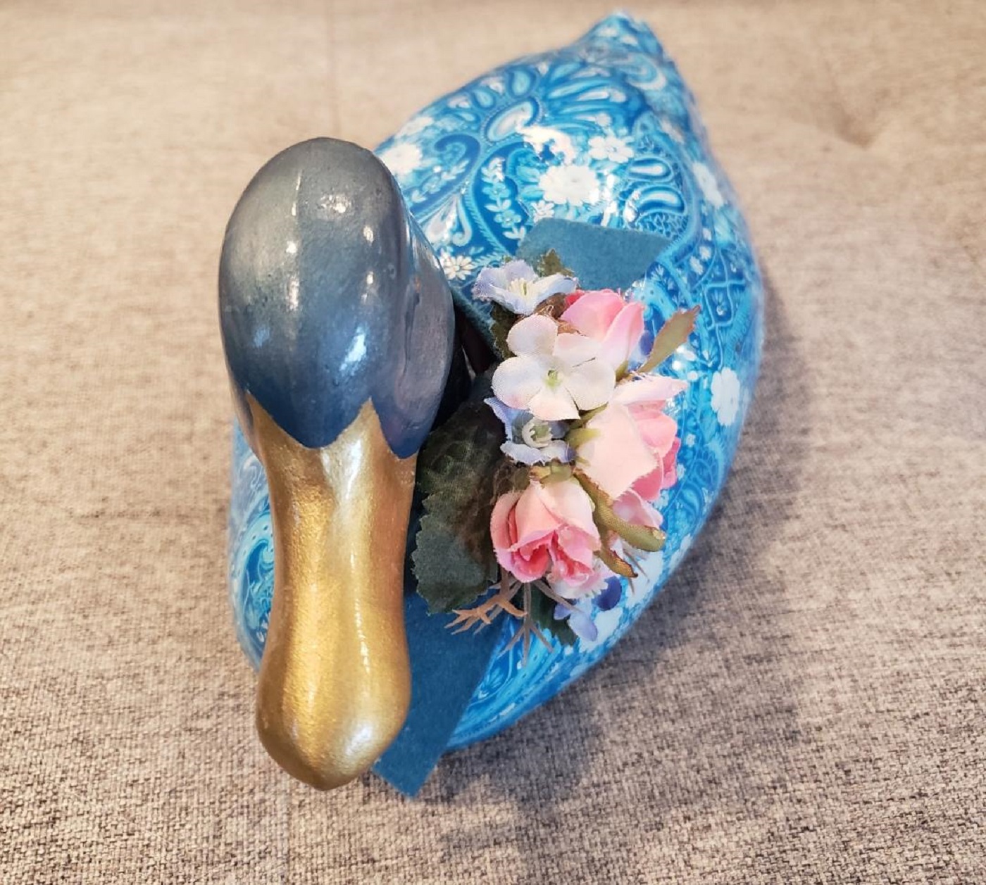 Handpainted blue duck head and gold beak with artificial flower necktie.