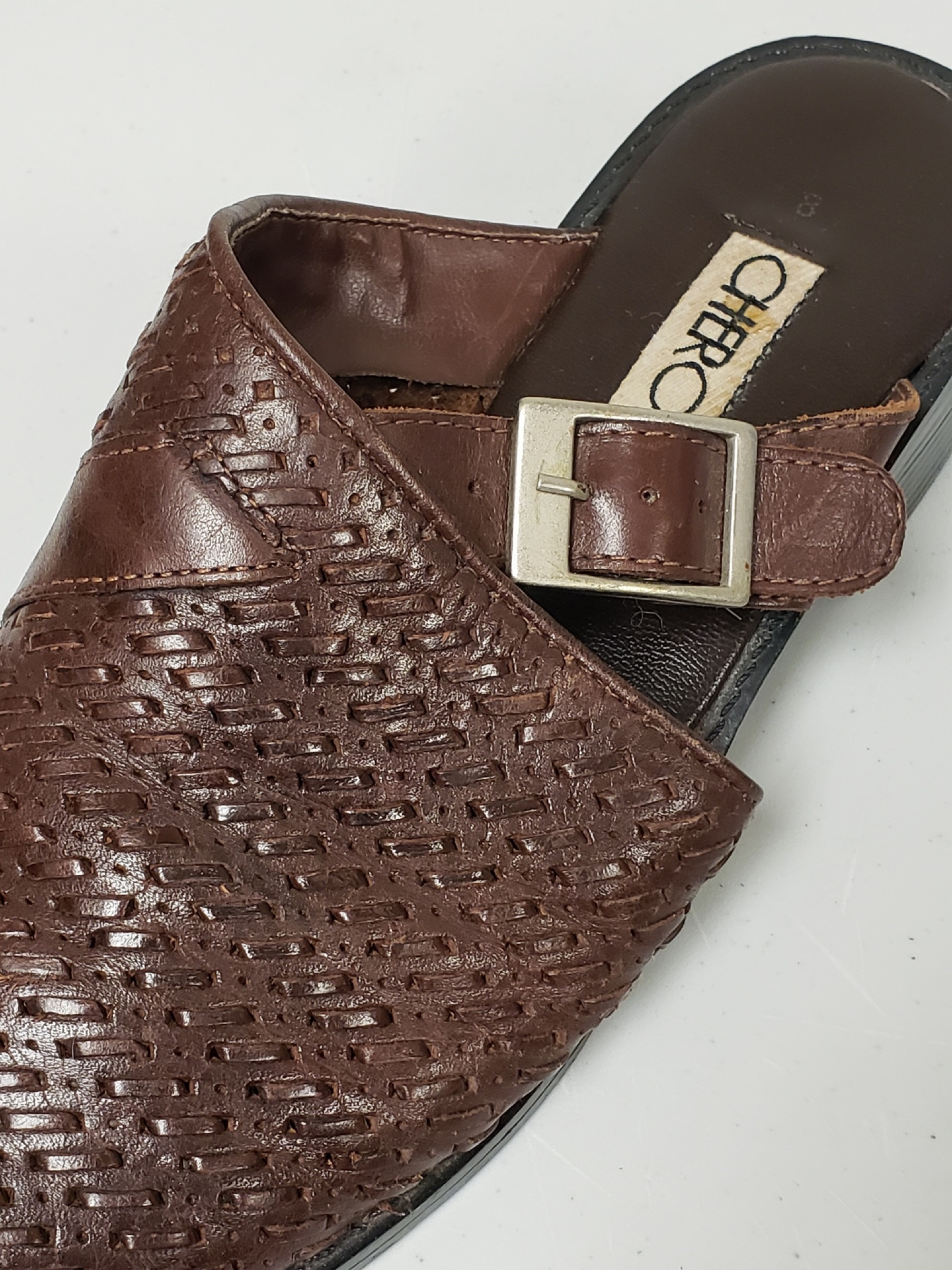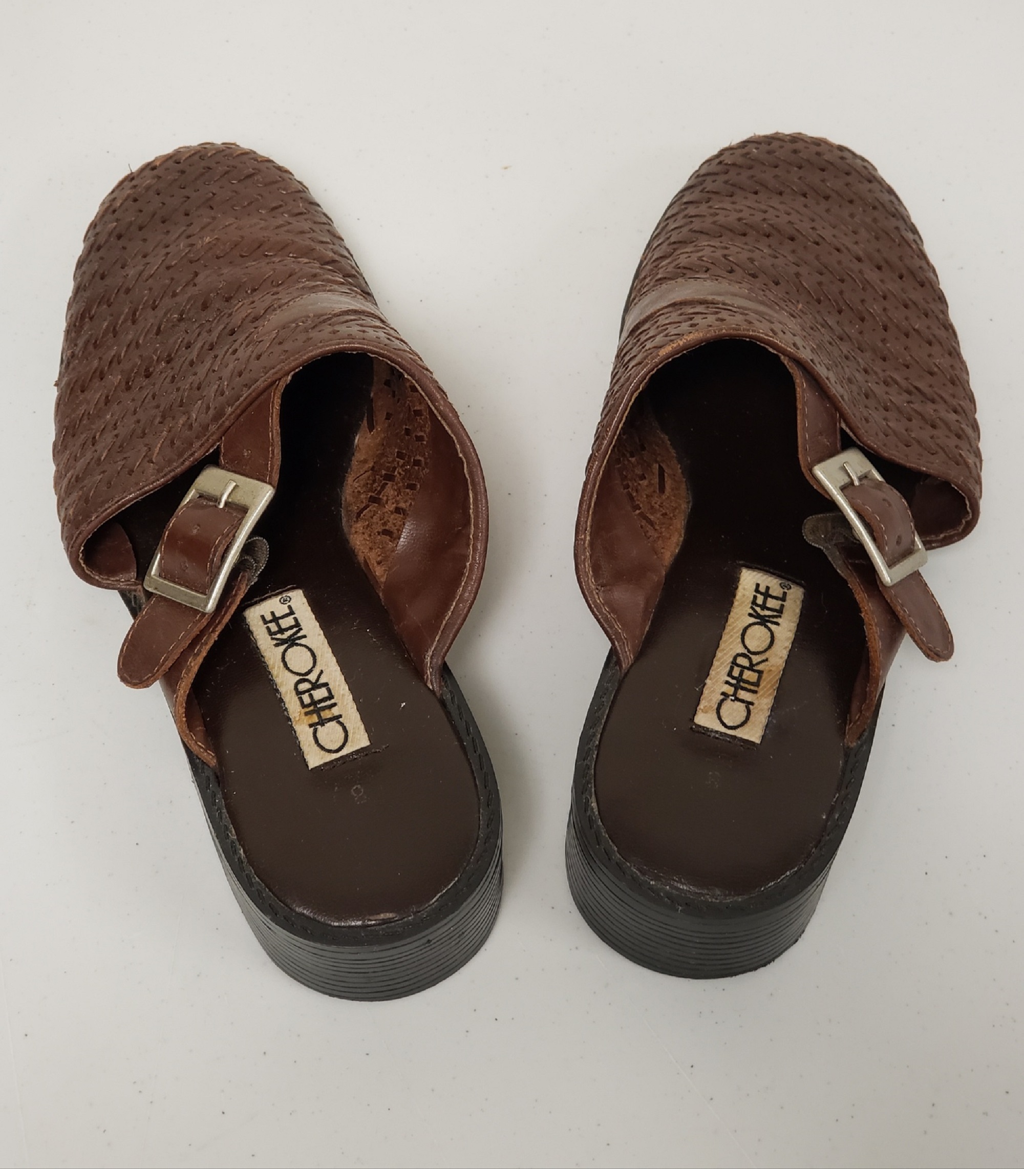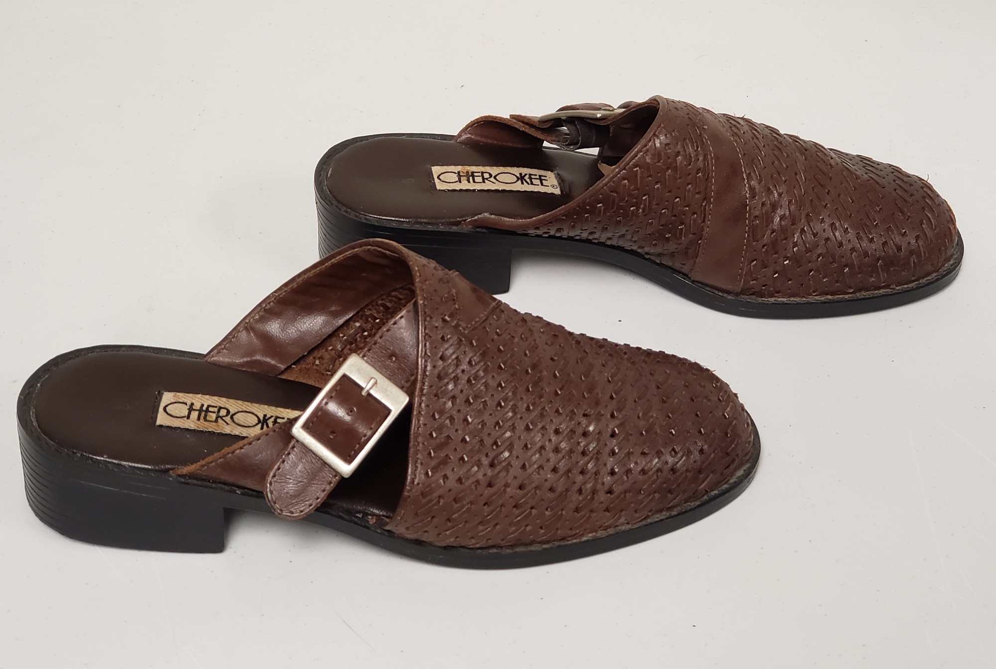 Vintage CHEROKEE brown leather weaved pattern with strap and buckle decor women's clogs/mules