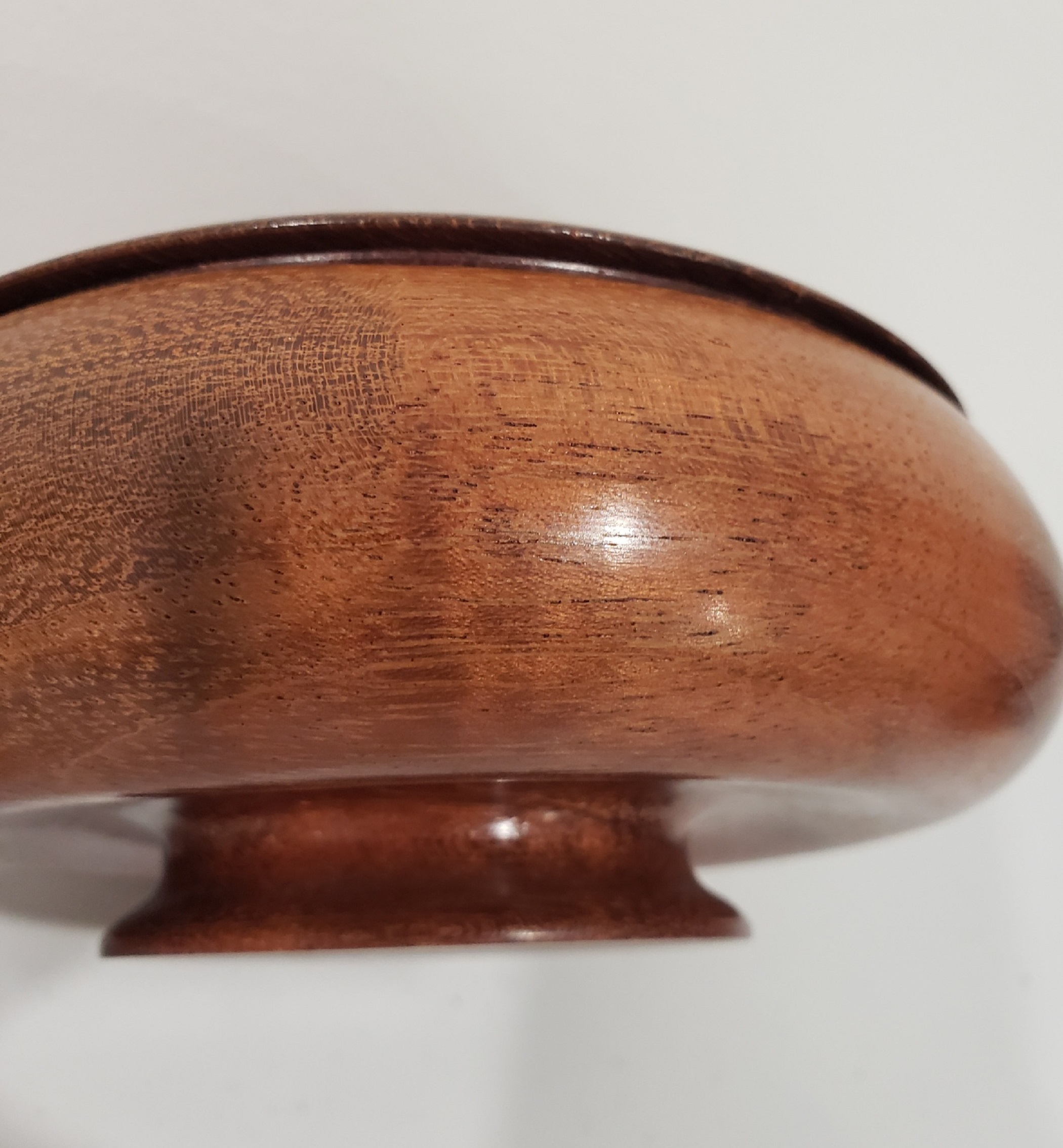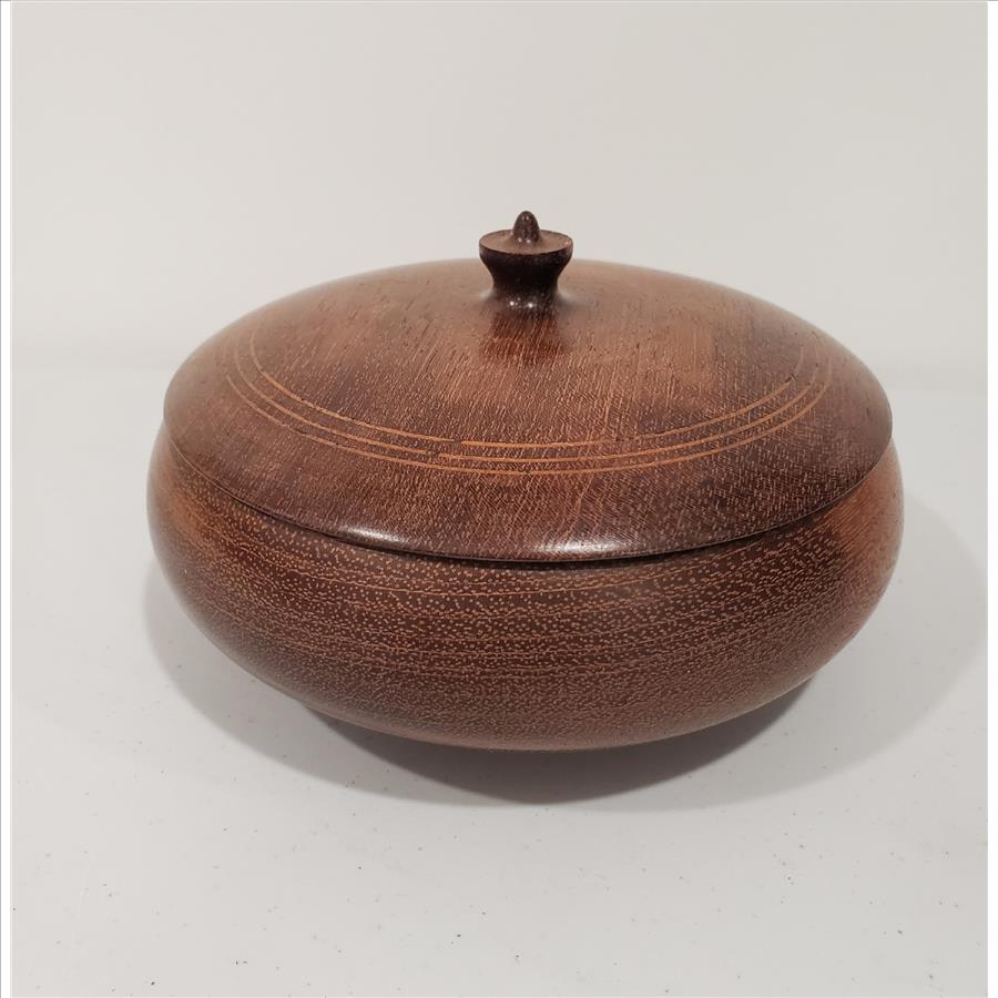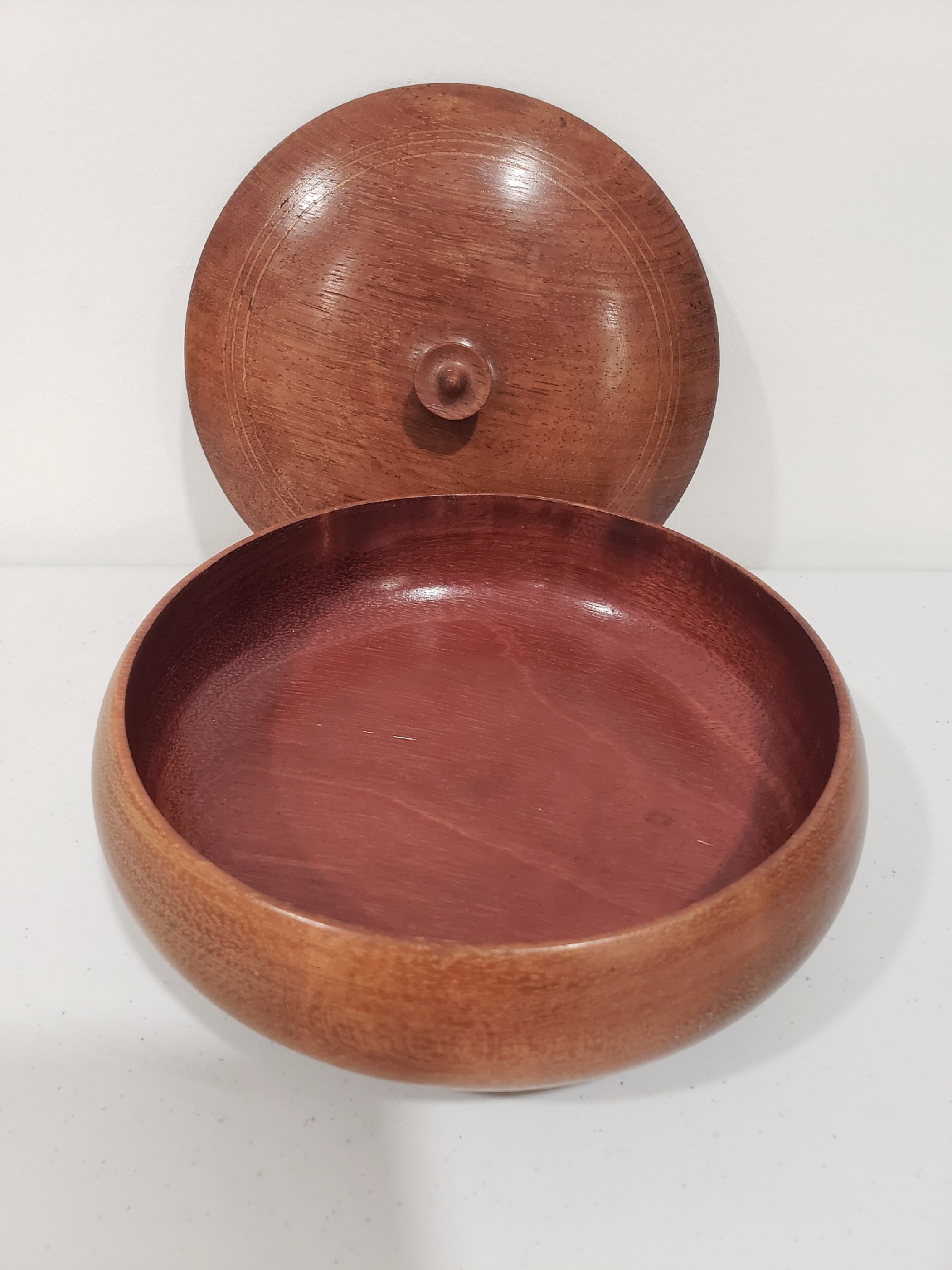 Vintage lacquer finished natural wood, footed, round storage container with lid