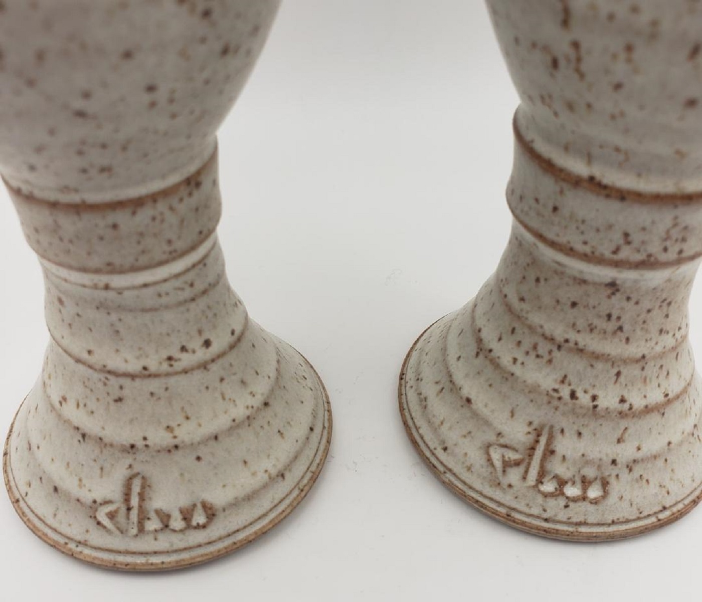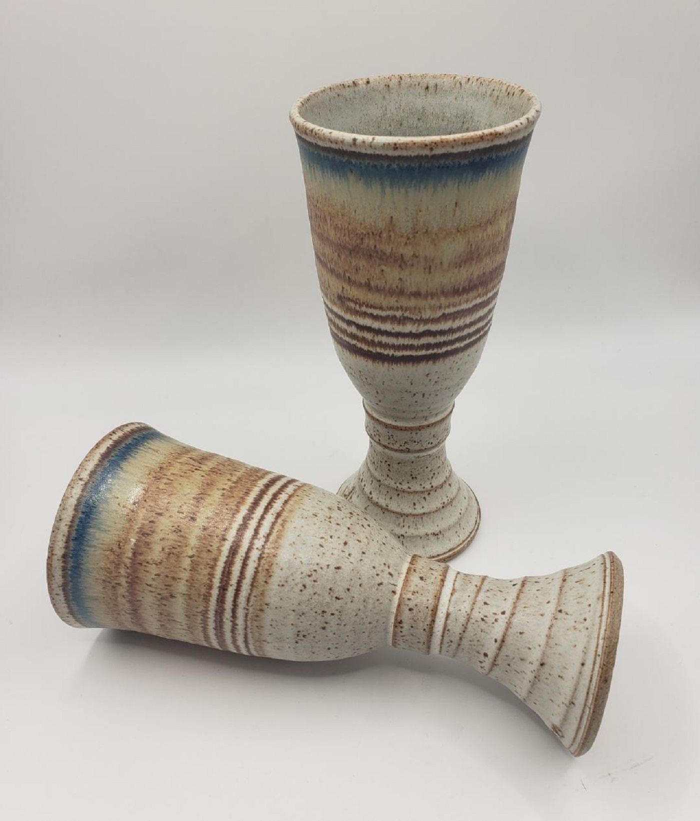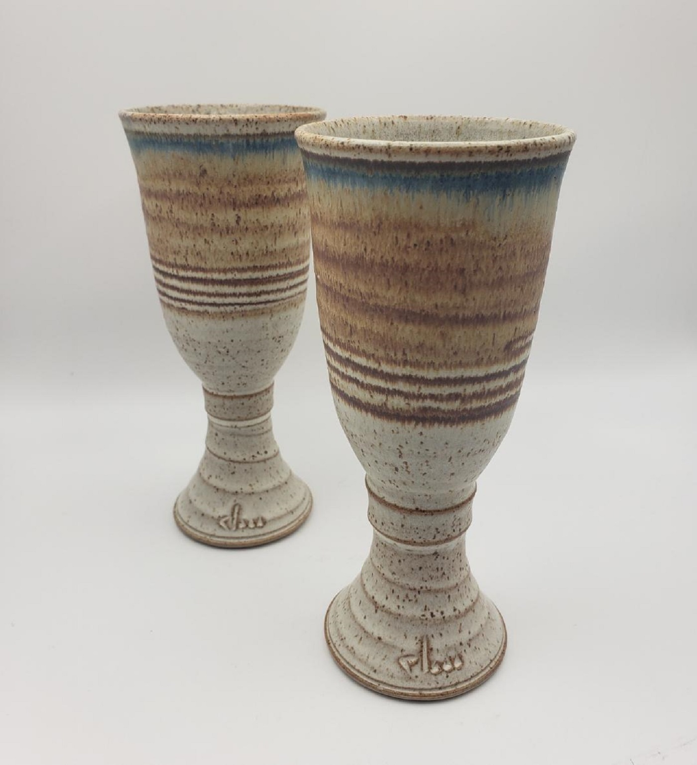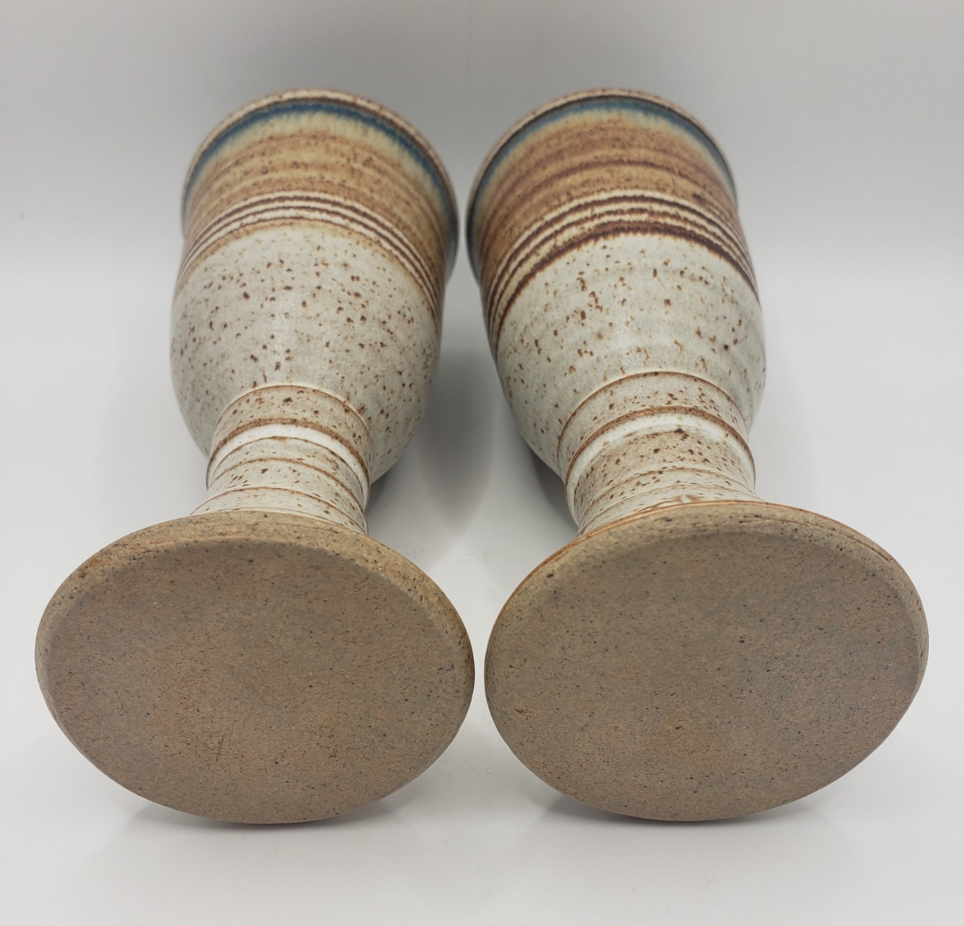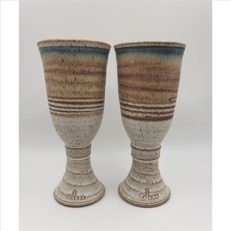 A pair of hand crafted pottery stoneware goblets with a creamy interior.