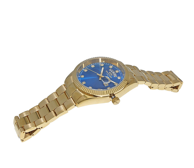 Dial Blue Sun-Ray Dial,  Date Window, Accented with Austrian Crystal Indicator, Gold tone minute - hour and second hand.