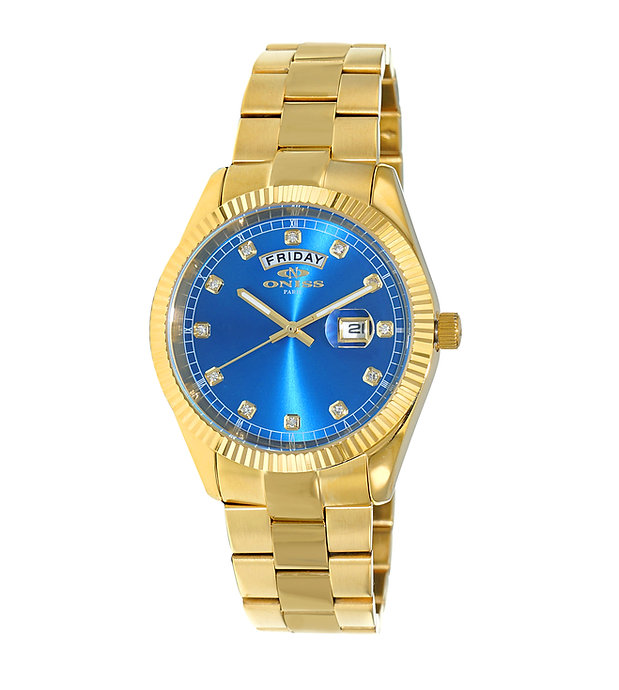 Dial Blue Sun-Ray Dial,  Date Window, Accented with Austrian Crystal Indicator, Gold tone minute - hour and second hand.