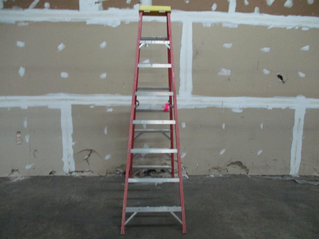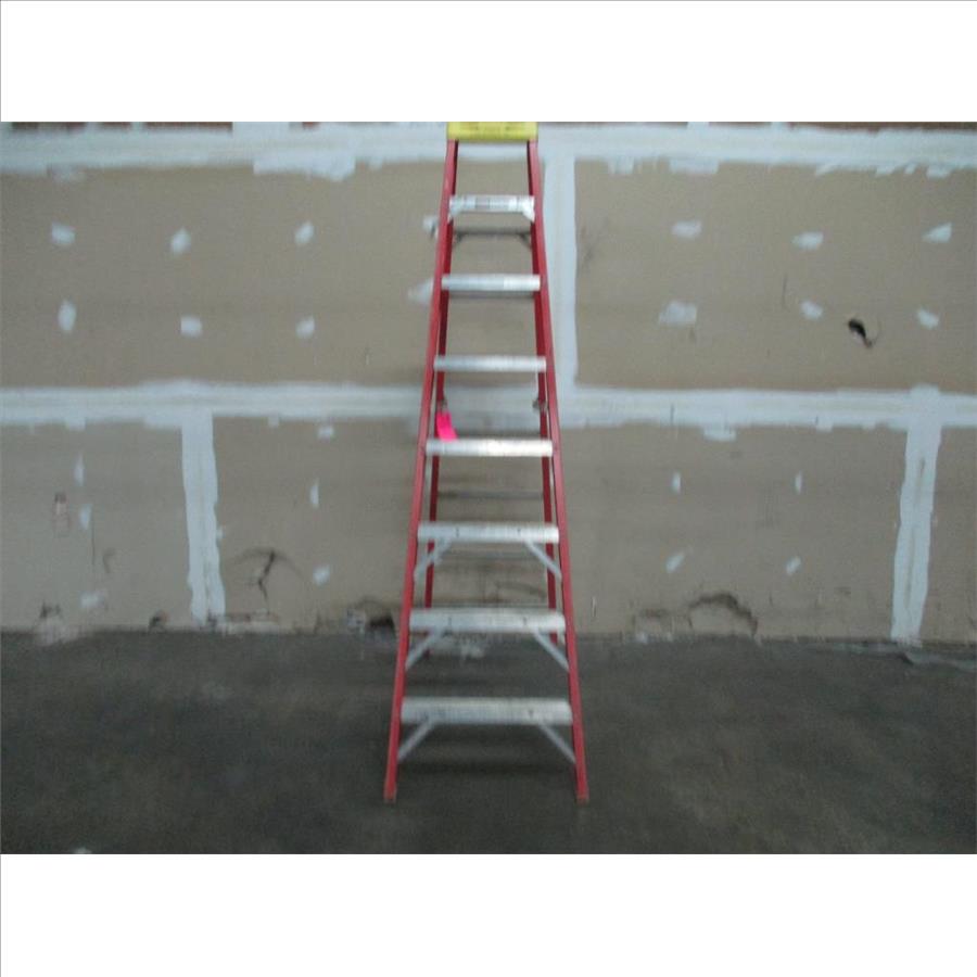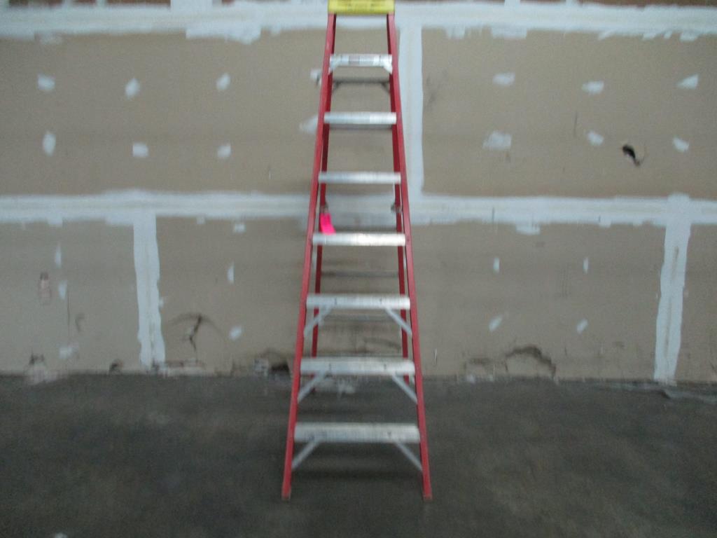 - 8' step ladder, 7 steps, max reach 12', highest standing level 5'9", 300 lbs weight capacity, extra heavy duty, fiberglass.