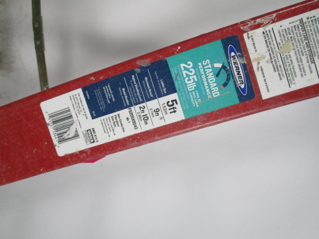 • Accessories: 5 step ladder, 4 steps, 225 weight capacity maximum, Reach 9", highest standing level Type II, 4 feet