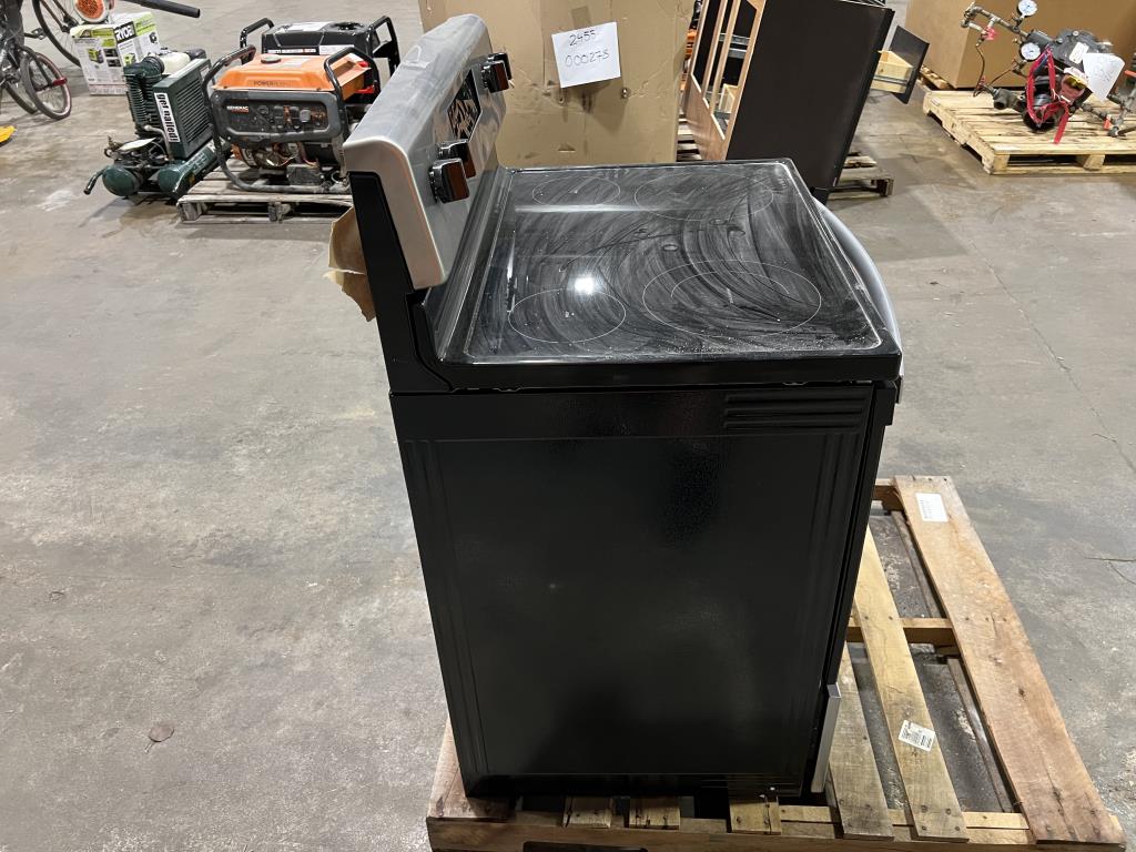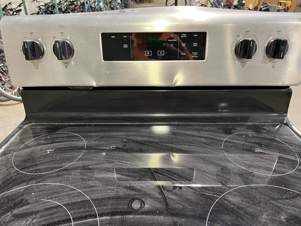- 4 burners, 2 shelves, broiler drawer, 4 burner knobs hi and medium and low, buttons, bake and broil and keep warm and start and cancel, temp time, timer, light, cook time, clock