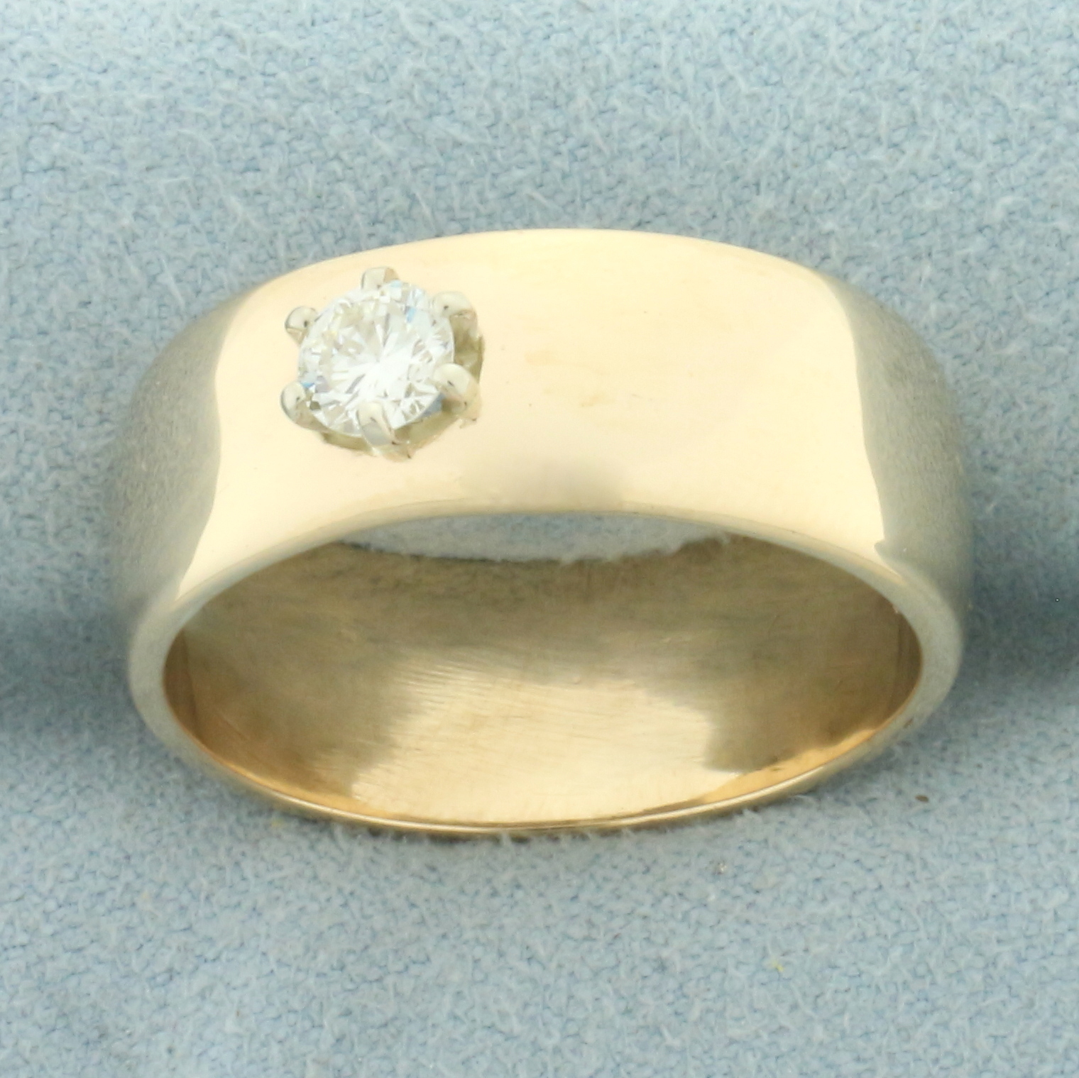 In 14k yellow gold. Contains one high quality 1/3ct round brilliant diamond, VS clarity/H color. 8.5mm wide. Size: 10.5. 9.4g.