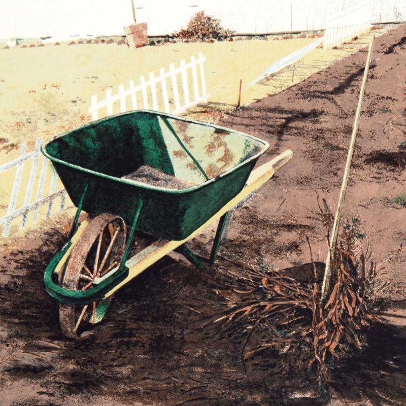 "The Wheelbarrow" is a limited edition lithograph on paper by William Nelson, numbered and hand signed by the artist! Measures approx. 28.5" x 22" (image).
