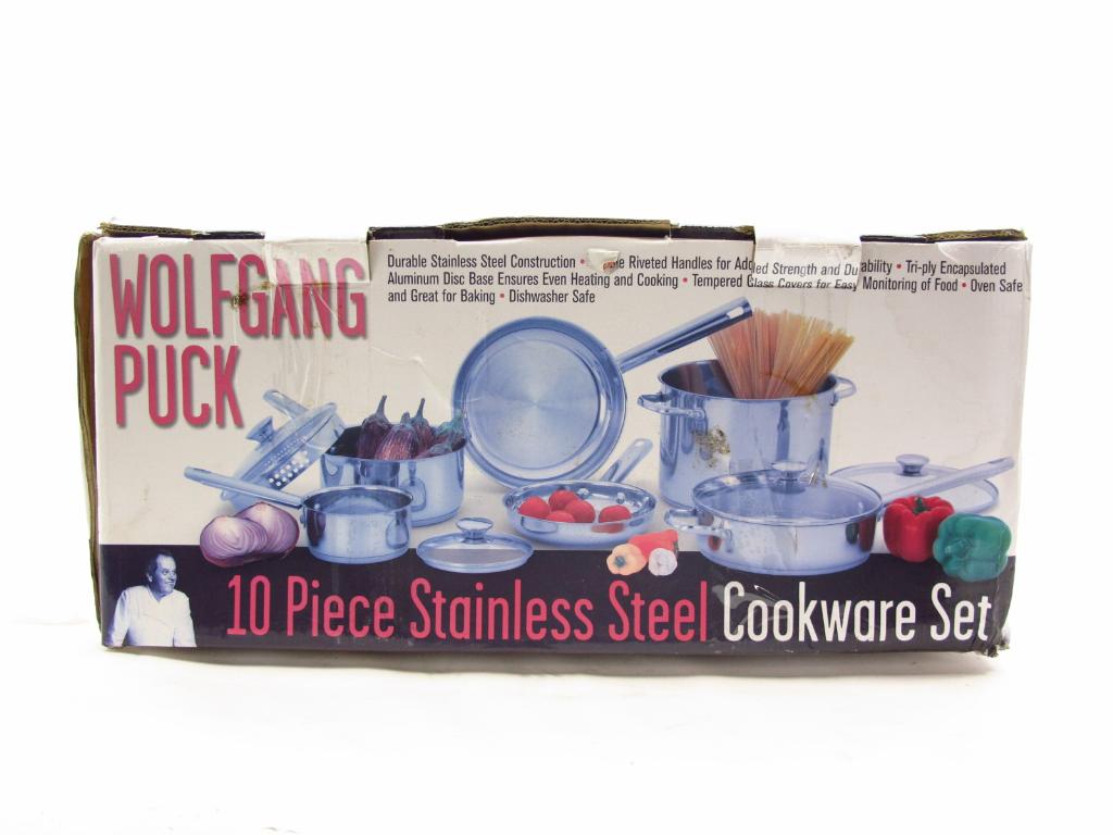 Get a great deal with this online auction for a cookware set presented by Property Room on behalf of a law enforcement or public agency client. Wolfgang Puck 10 Piece Stainless Steel Model: R10PCSET Measurements of Box: 22"x13.5"x10" Cosmetic Condition: Excellent, opened to verify contents. Condition: Excellent