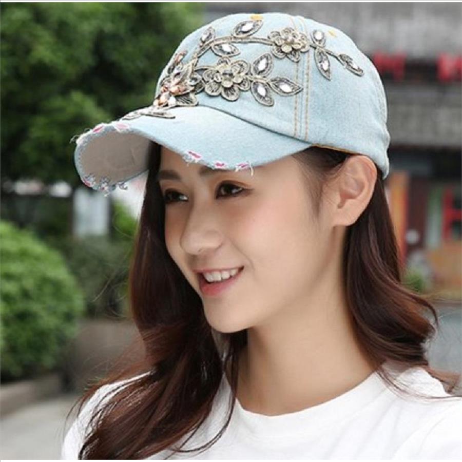 Women Applique Flower Embossed Rhinestone Denim Baseball Cap