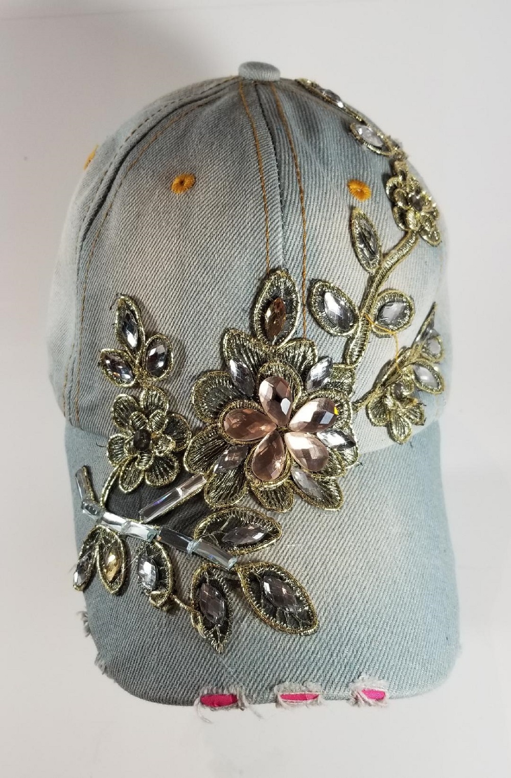 Fashionable denim baseball cap beautifully decorated with floral and rhinestone applique.