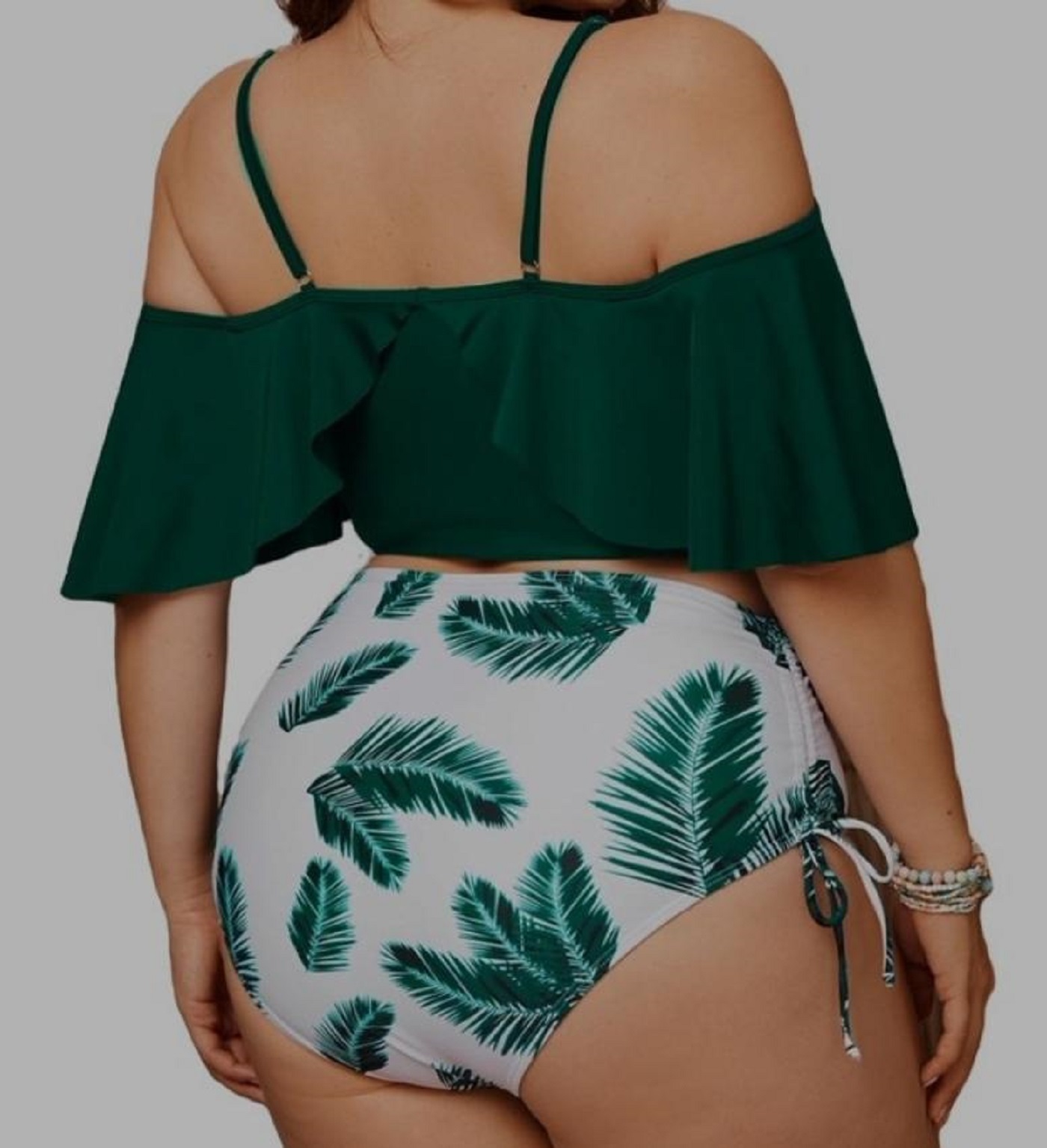 Women's 2 Piece Ruffled Solid Top Leaf Print Boho Tie Side Swimsuit Sz 2XL