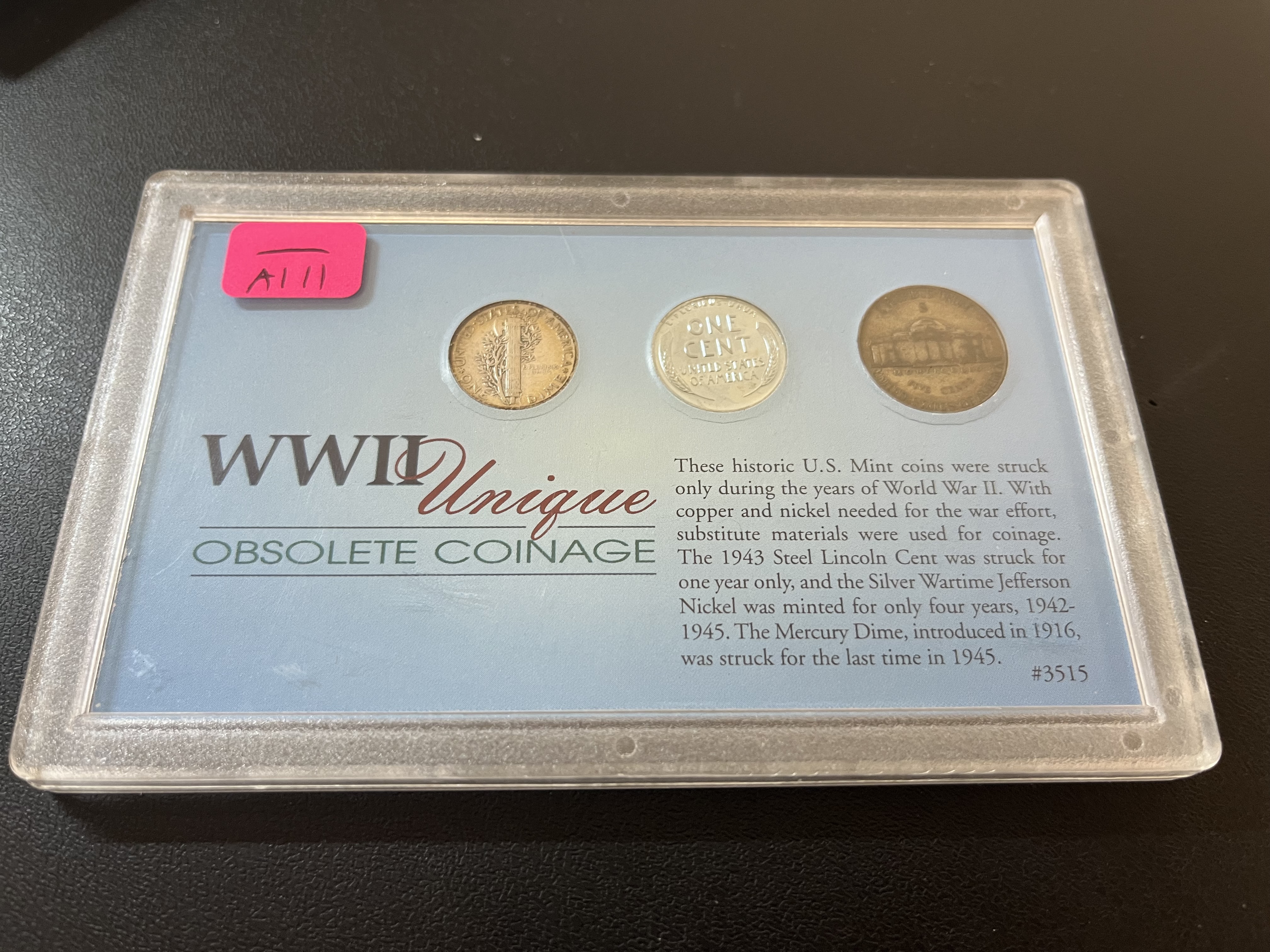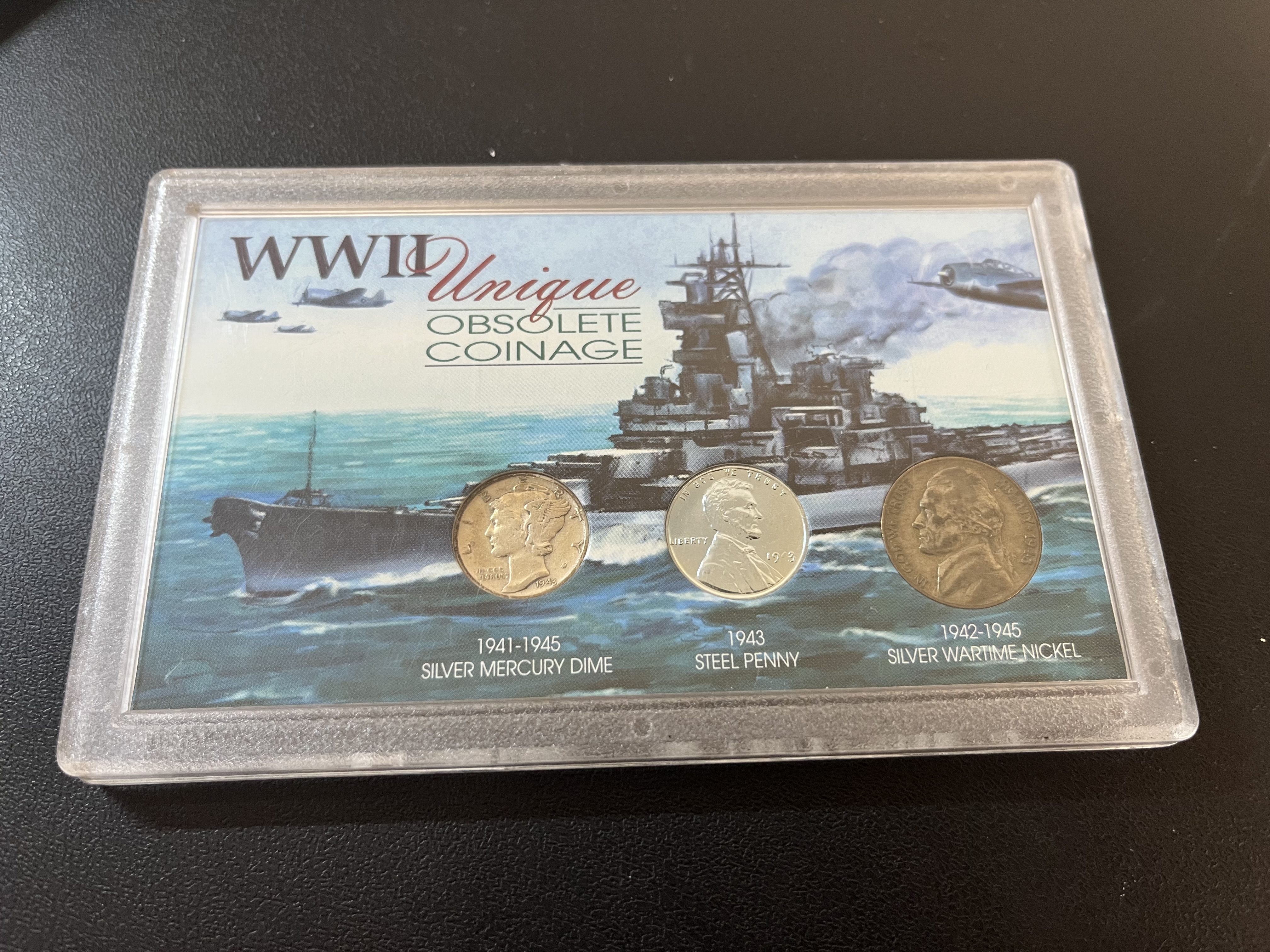 SET INCLUDES 90% SILVER MERCURY DIME, 1943 STEEL/ZINC PENNY AND 35% SILVER JEFFERSON NICKEL