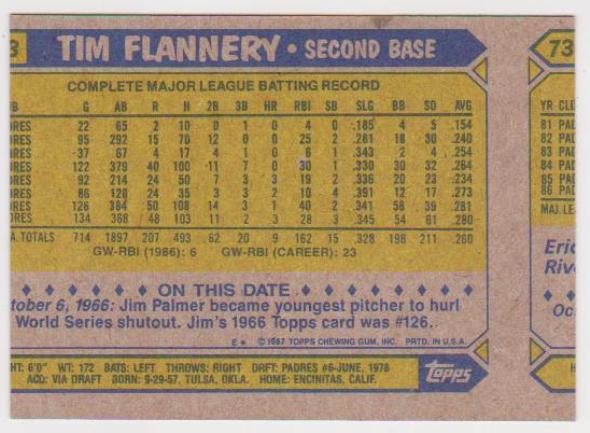 This is a 1987 Topps Reggie Jackson Turn Back The Clock card with a very unusual error.  This one was printed wrong and has an off center Tim Flannery back.  Most of these error cards are destroyed at the factory and very few ever get out.  This is a nice Near Mint condition error card of this baseball Hall of Famer.