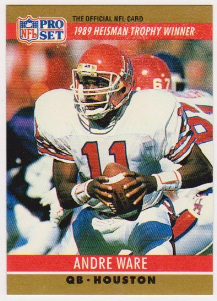 This is a 1990 Pro Set Bo Jackson Wrong Front Error Card. This one has Andre Ware on the front but has the Bo Jackson #155 back.  It is in approximately VG-EX to EX condition.  It has a small light water stain on one edge of the Jackson side, but otherwise displays nicely.