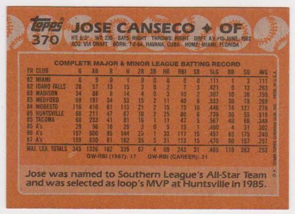 Wrong Front Error - Jose Canseco 1988 Topps Card