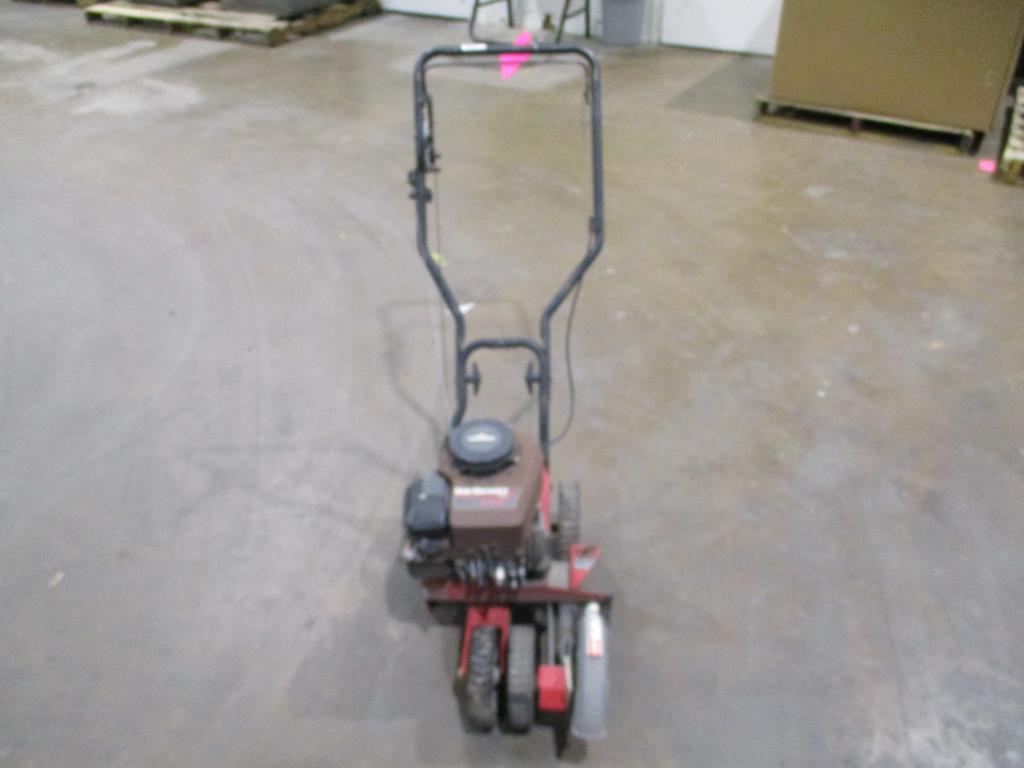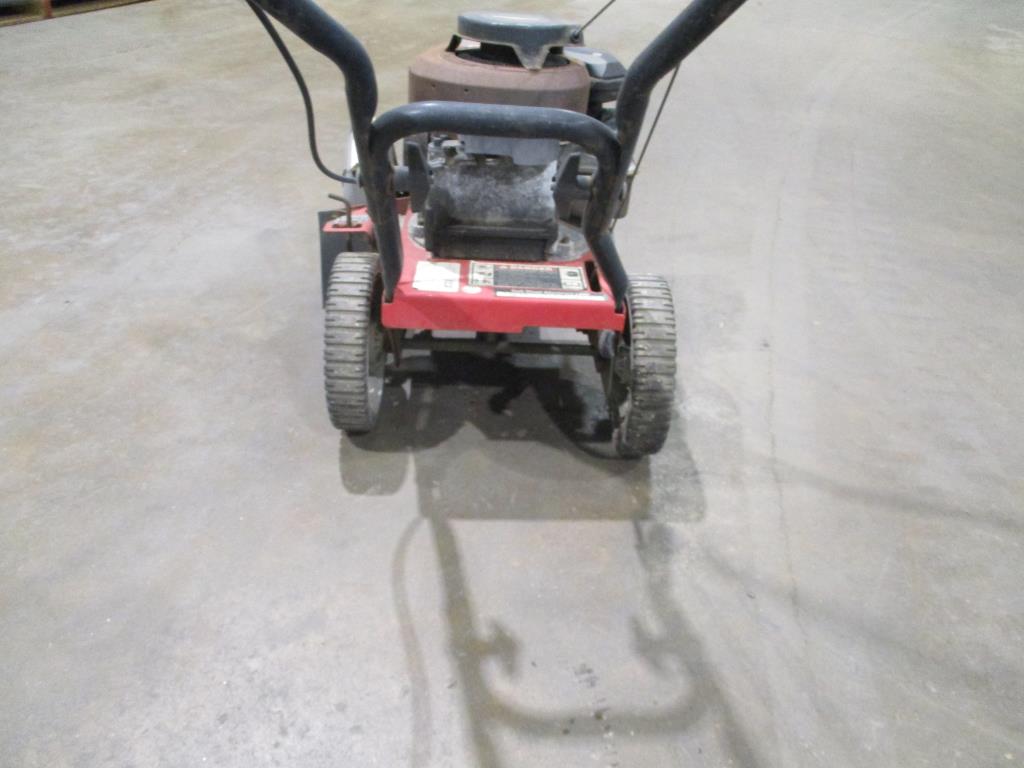 - Item info: gas powered, pull cord start, self propelled, blade depth control, handle with 4 wheels for easy mobility, line guard, briggs and stratton engine, 3.5 HP, adjustable blade angle lever