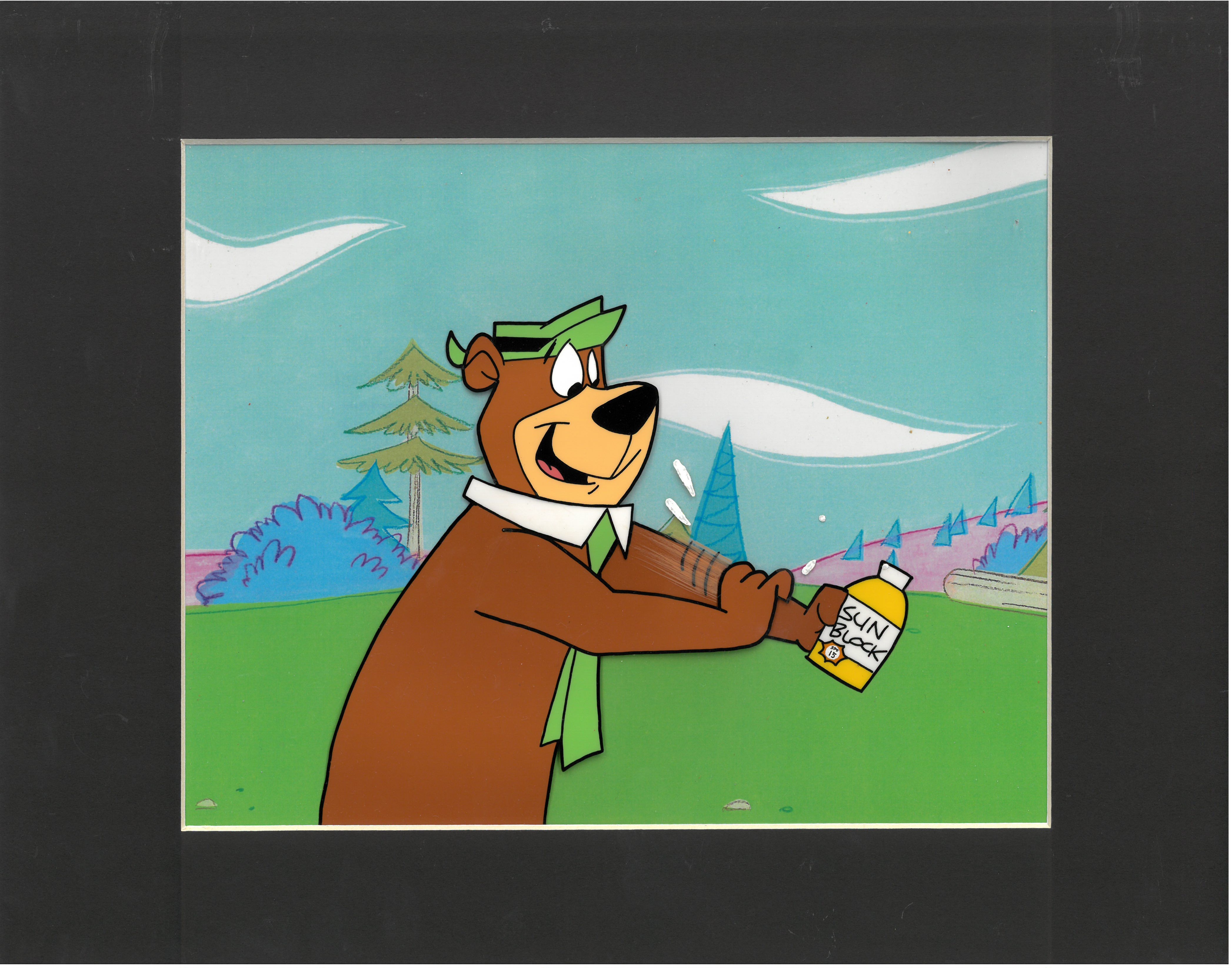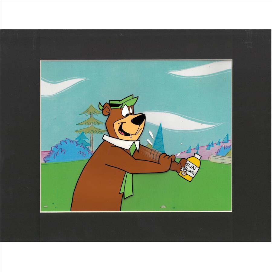 This Production Cel features Yogi Bear.  This cel was used in the Hanna-Barbera TV PSA/Commericals "Sunscreen" which aired in 1992 and was produced by Playhouse Pictures Hollywood. Matted with COA