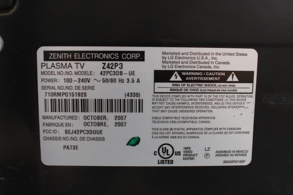 Get a great deal with this online auction for a TV presented by Property Room on behalf of law enforcement or public agency client. Model: 42PC3D8-UE Screen Size: 42" Date of Manufacture: October 2007 Measurements: 44.4"x27.4"x3.75" Base: Included [Broken] Remote Control: None Included Power Cord: Included Accessories: Wall Mounting Bracket Physical Condition: Marks, Scratches, Scuffs, and Dents On Casing; Tape Residue on Casing; Screen is Scratched Testing Results: Item was tested for power only and it powered on, displayed menu. Input and output ports were not tested and may be non-functional. Item is sold "As Is".